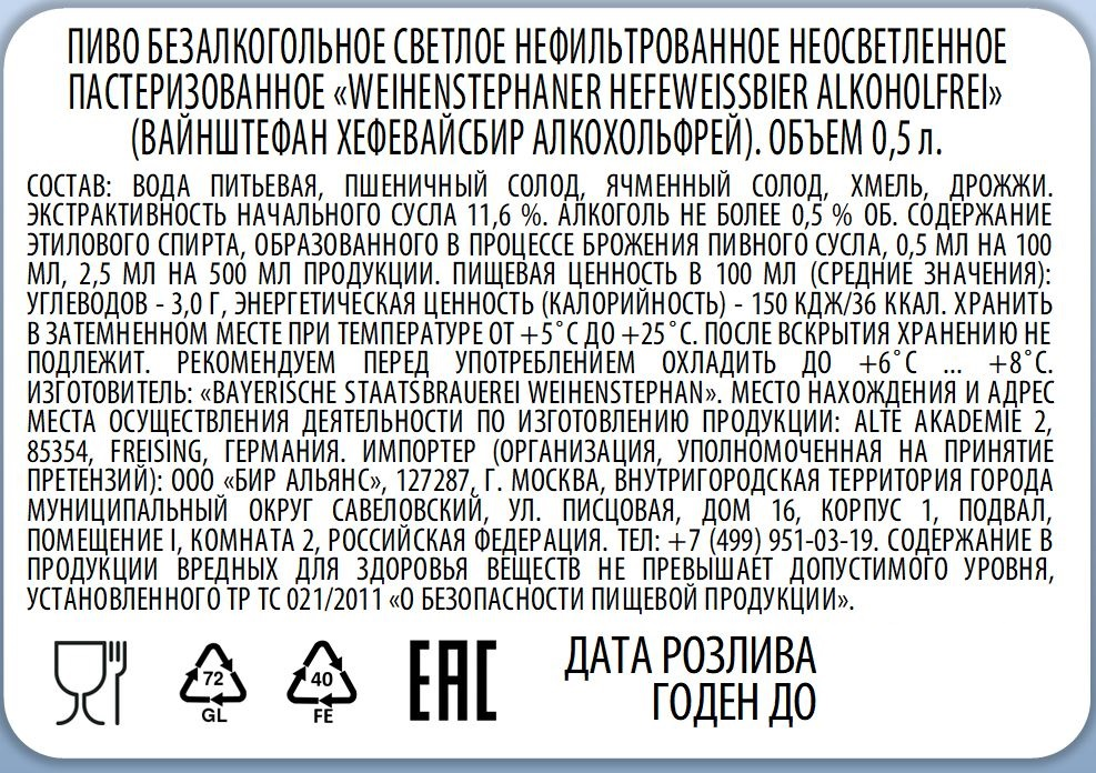 Светлое нефильтрованное пиво Weihenstephaner Hefeweissbier Alkoholfrei является низкокалорийной альтернативой оригинальному пиву Weihenstephaner Hefeweissbier. Пиво варится в соответствии с многовековыми пивоваренными традициями только из натуральных ингредиентов высшего качества, имеющих официальный сертификат Баварии: пшеничного солода, хмеля из долины Халлертау, чистой горной воды и дрожжей. Процесс брожения не прекращается, пока пиво полностью не созреет. Затем спирт удаляется в вакуумном испарителе нисходящего потока, который был разработан в сотрудничестве с Техническим университетом Мюнхена. В результате получается безалкогольное пиво (менее 0,5%) с меньшим количеством калорий и сахара, но при этом сохраняются все витамины, микроэлементы и минералы. Таким образом, Weihenstephaner Hefeweissbier Alkoholfrei станет отличным выбором для активных, ведущих здоровый образ жизни людей, которые ценят вкус классического пива.