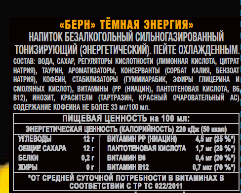 Вода, сахар, регуляторы кислотности (лимонная кислота, цитрат натрия), таурин, ароматизаторы, консерванты (сорбат калия, бензоат натрия), кофеин, стабилизаторы (гуммиарабик, эфиры глицерина и смоляных кислот), витамины (РР (ниацин), пантотеиновая кислота, В6, В12), инозит, красители (тартразин, красный очаровательный ас), содержание кофеина не более 33г/100мл.