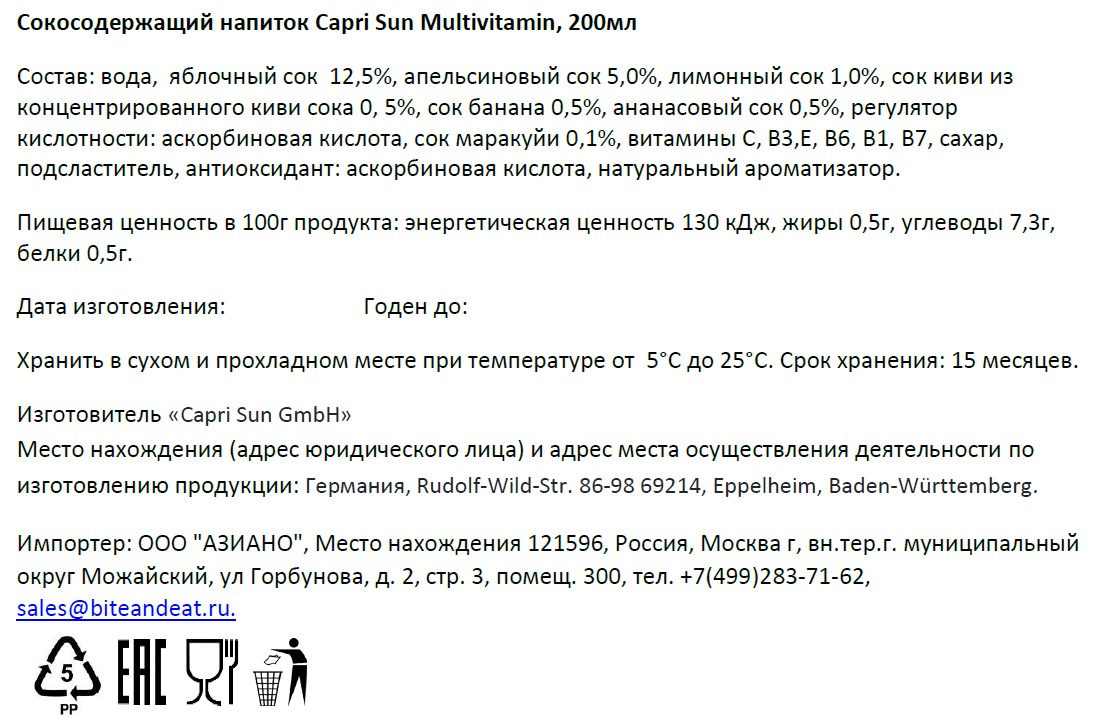 Напиток сокосодержащий детский Capri-Sun Multivitamin (детский сок Капри сан мультивитамин) 200мл. Сок без красителей, консервантов и подсластителей. Удобная мягкая упаковка с бумажной трубочкой, удобно брать на прогулку. Попробуйте мультифруктовый вкус, который сохранил в себе всю свежесть фруктов: апельсина, яблока, ананаса, банана, киви и маракуйи. Натуральные ингредиенты без красителей, консервантов и подсластителей. Удобная упаковка, которую легко брать с собой.