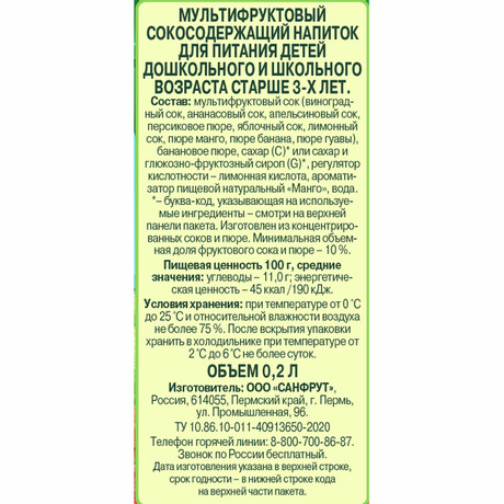 Мультифруктовый сок (виноградный сок, ананасовый сок, апельсиновый сок, персиковое пюре, яблочный сок, лимонный сок, пюре манго, пюре банана, пюре гуавы), банановое пюре, сахар (С)* или сахар и глюкозно-фруктозный сироп (G)*, регулятор кислотности-лимонная кислота, ароматизатор пищевой натуральный Манго.