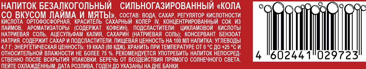 Вкус классической колы в идеальном сочетании с экзотическим лаймом и прохладой душистой мяты. Идеально подходит тем, кто хочет утолить жажду и насладиться колой с необычным и освежающим вкусом. Лимонад, сочетающий вкус классической колы, экзотического лайма и прохладной душистой мяты. Прекрасно подходит тем, кто хочет утолить жажду и насладиться колой с необычным и освежающим вкусом. Напиток прекрасно утолит жажду в знойную погоду и подарит глоток летней свежести зимой. Рекомендуется пить охлажденным.