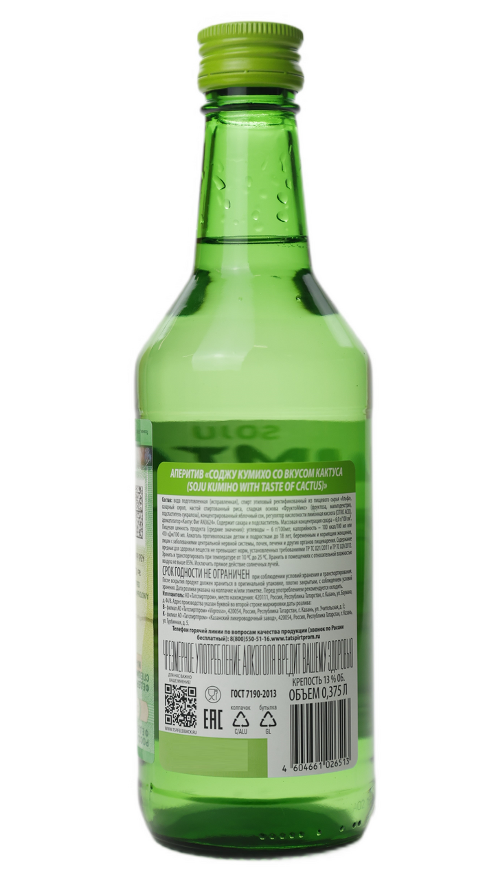 Соджу - традиционный корейский алкогольный напиток, его крепость обычно составляет около 13-15%, что делает его легче многих крепких спиртных напитков. Новинка в ассортименте компании Татспиртпром, соджу со вкусом кактуса. На этикетке изображена девятихвостая лиса Кумихо, символизирующая дух леса в корейской мифологии.Употребление соджу часто сопровождается традициями, такими, как особые ритуалы при наполнении бокалов и произнесении тостов. В Корее принято наливать напиток друг другу, что подчеркивает дружеские связи и уважение между участниками застолья. Соджу обычно подается в небольших рюмках и часто употребляется с закусками, что помогает создать гармонию вкусов. Напиток можно также использовать в коктейлях, смешивая его с фруктовыми соками или газированными напитками.