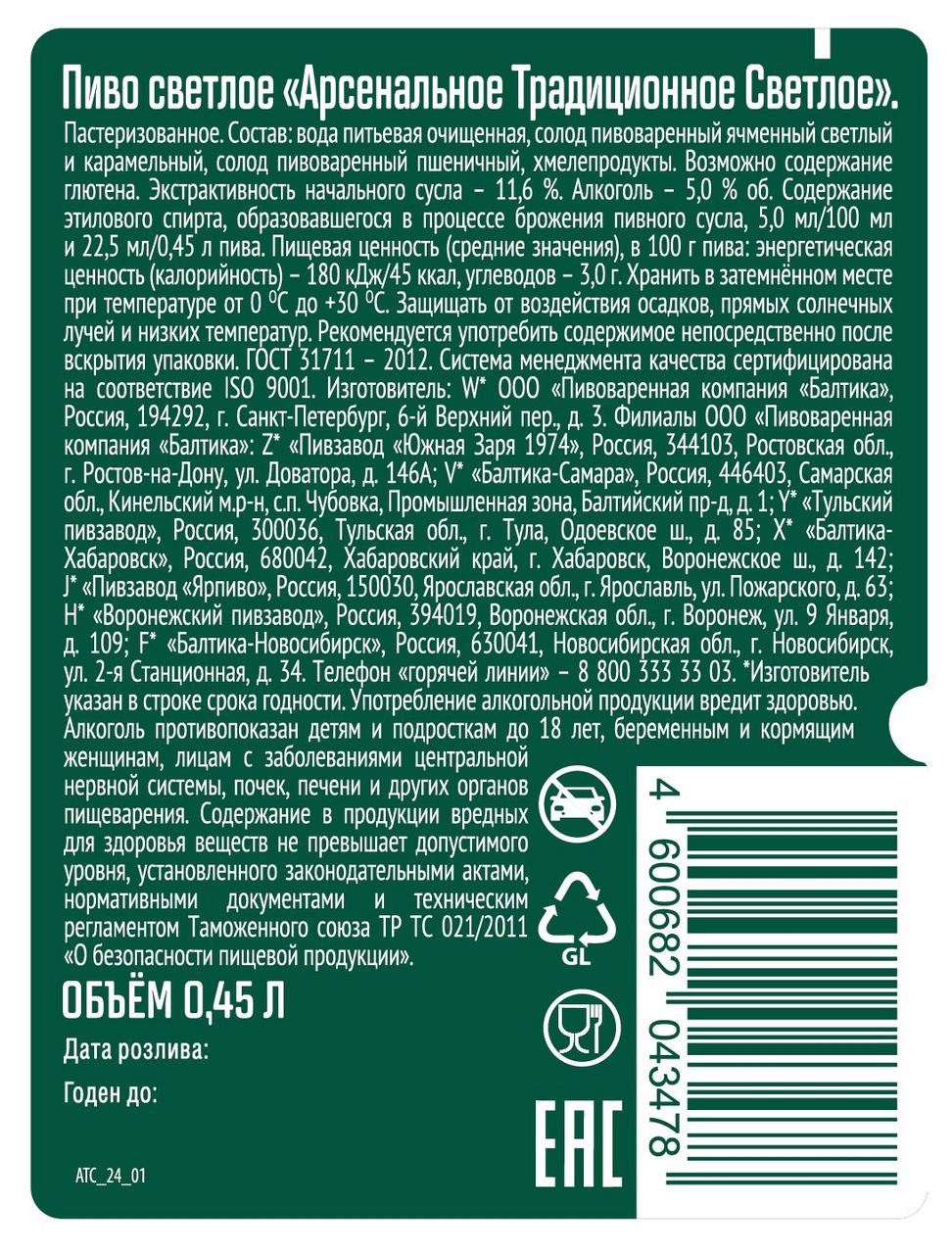 Пиво Арсенальное традиционное светлое, 0.45л - родом из Тулы и воплощает в себе мужественность и опыт города мастеров и оружейников. В аромате пива переплетаются фруктово-хмелевые ноты, дополненные мягкой горчинкой во вкусе, что делает это пиво идеальным для каждого дня.