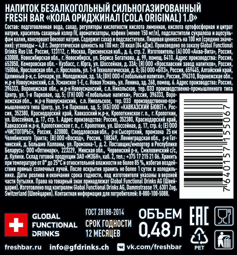 Напиток Fresh Bar Cola Original газированный, 480мл x 12 шт