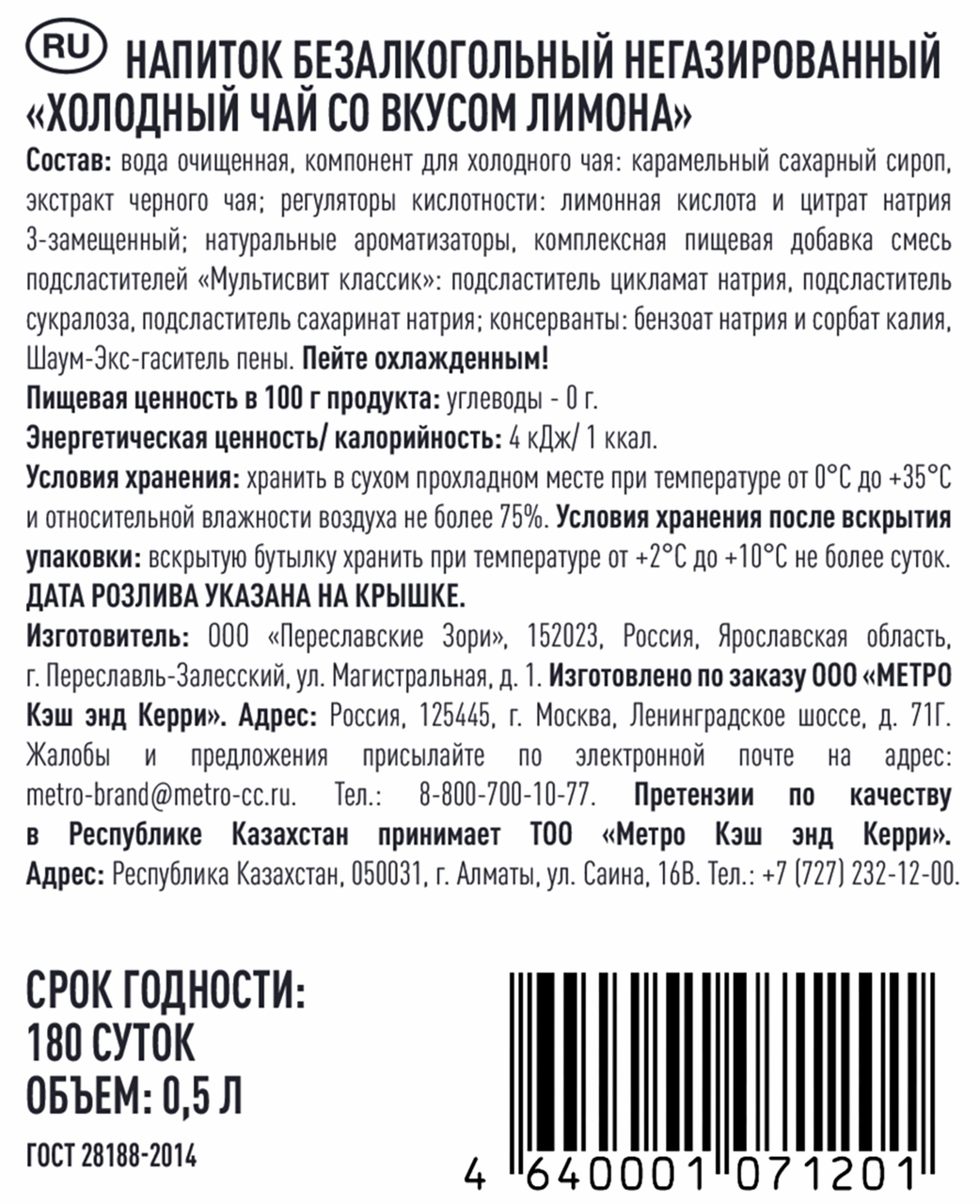 Вода очищенная, компонент для холодного чая: карамельный сахарный сироп, экстракт черного чая, регуляторы кислотности: лимонная кислота и цитрат натрия 3-замещенный, натуральные ароматизаторы, комплексная пищевая добавка смесь подсластителей Мультисвит классик: подсластитель цикламат натрия, подсластитель сукралоза, подсластитель сахаринат натрия, консерванты: бензоат натрия и сорбат калия.