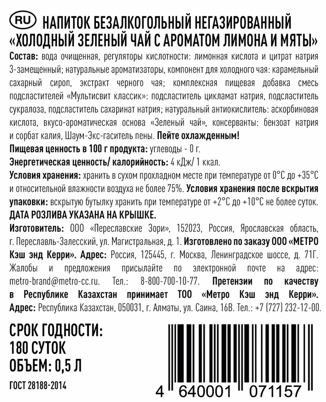 RIOBA Чай холодный зеленый лимон-мята, 500мл будет дарить заряд бодрости для удивительных открытий и новых идей каждый день. Это то, что нужно для утоления жажды и ощущения свежести в жару или после тяжелого дня. Бодрящие нотки лайма помогут зарядиться энергией, а свежий аромат мяты по-новому раскроет вкус натурального зеленого чая. Рекомендуется употреблять в охлажденном виде. Благодаря удобному формату бутылочку с чаем можно взять с собой.
