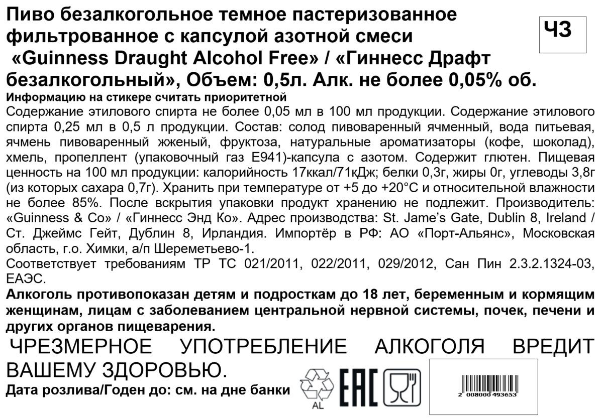 Пиво Guinness Draught безалкогольное, 0.5л x 24 шт - безалкогольный вариант классического темного ирландского сухого стаута. Легендарное пиво, создающееся из жженого солода, карамельного солода, жареного ячменя и хмеля. Эти ингредиенты придают пиву темный коричневый цвет, жженые и дымные нотки, а также оттенки кофе во вкусе. Интересно, что термин стаут, который сначала имел значение гордый, отважный, а начиная с XIV века - крепкий, был впервые для обозначения пива использован в 1820 году именно компанией Гиннесс. Пиво хорошо сочетается с мясом, приготовленным на гриле, копченым мясом, барбекю, блюдами латиноамериканской кухни, шоколадом.
