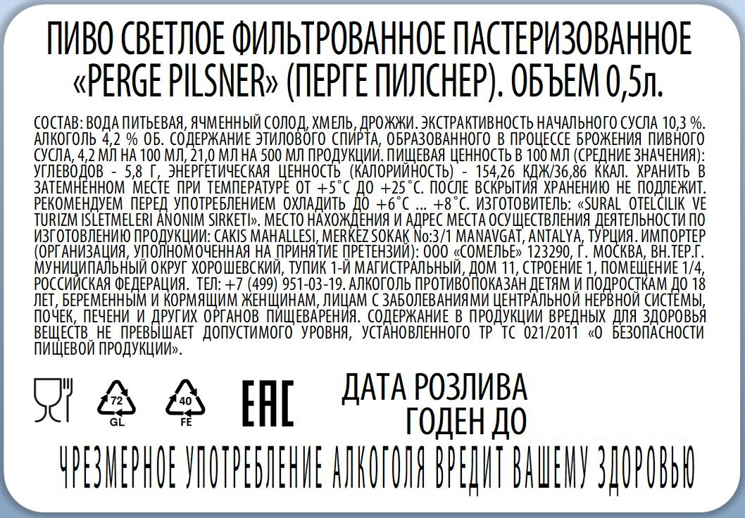 Perge Malt - светлое фильтрованное пастеризованное пиво, сваренное в стиле классического немецкого Пилснера. Оно обладает легким, питким, четким вкусом с заметной хмелевой горечью, освежающими травяными нотками и деликатной солодовой сладостью. Светлое фильтрованное пастеризованное пиво, сваренное в стиле классического немецкого Пилснера. Оно обладает легким, питким, четким вкусом с заметной хмелевой горечью, освежающими травяными нотками и деликатной солодовой сладостью.Пиво изготавливается по новейшим технологиям с использованием самых высококачественных и натуральных ингредиентов: лучшего, тщательно отобранного хмеля и высококачественного солода из Германии, а также из природной родниковой воды, которая течет через леса с высоты 1400 метров и добывается из источников Burmahan в регионе Анталья.