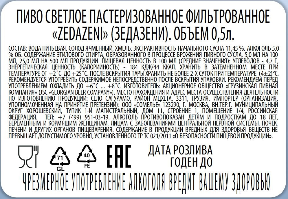 Zedazeni - флагман Грузинской пивной компании, светлый лагер, обладающий приятной хмелевой горечью во вкусе. Пиво Зедазени изготавливается из высококачественного немецкого сырья с использованием родниковой воды. Рецепт пива был разработан на основе чешских традиций пивоварения, а производственный процесс осуществляется в соответствии с самыми последними разработками в технологии пищевых продуктов и напитков.
