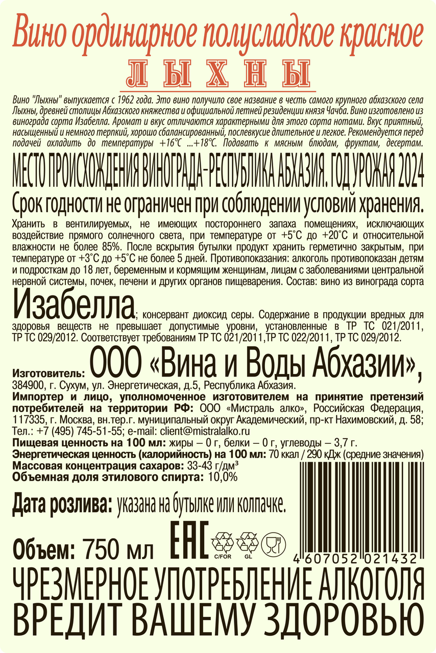 Вино Лыхны красное полусладкое, 0. 75л изготавливается из винограда сорта изабелла , произрастающего на в Абхазии. Процесс производства классический, после сбора ягоды прессуют, подвергают ферментации в стальных емкостях при контролируемой температуре. Напиток выдерживается в дубовых бочках. Цвет вина насыщенно-рубиновый, рассыпается в бокале гранатовыми искрами при искусственном и естественном освещении. Аромат чистый, притягивает тонами земляники и розы. Напиток отличается округлым освежающим вкусом, послевкусие фруктовое, продолжительное, присутствует приятная кислинка. Подавать рекомендуется к красному мясу, фруктам, десертам, овощам, приготовленным на гриле. Допускается сервировать вино сырной тарелкой, состоящей из молодых мягких сортов. Алкоголь подчеркивает вкус пищи, позволяя заиграть ему новыми красками. Напиток подавать охлажденным до 16-18 градусов, температуру можно поддерживать при помощи ведерка со льдом.