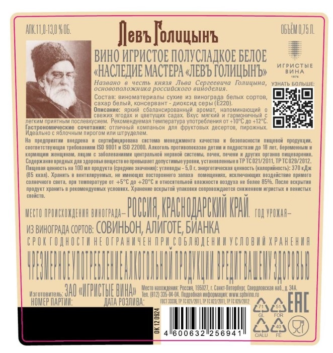 Вино игристое Левъ Голицынъ белое полусладкое, 0.75л