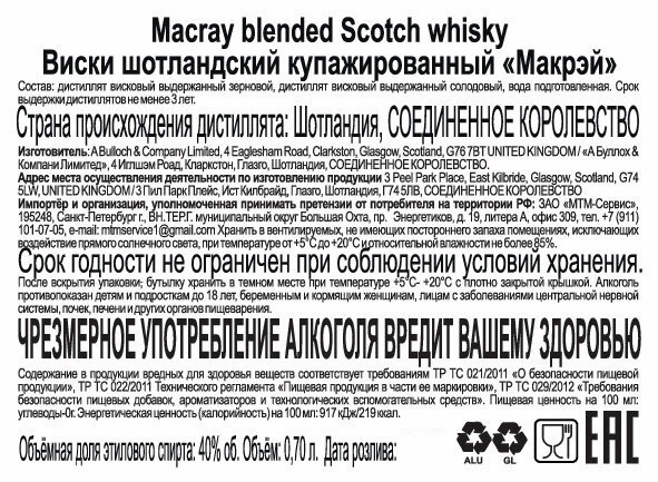 Дистиллят висковый выдержанный зерновой, дистиллят висковый выдержанный солодовый, вода подготовленная.