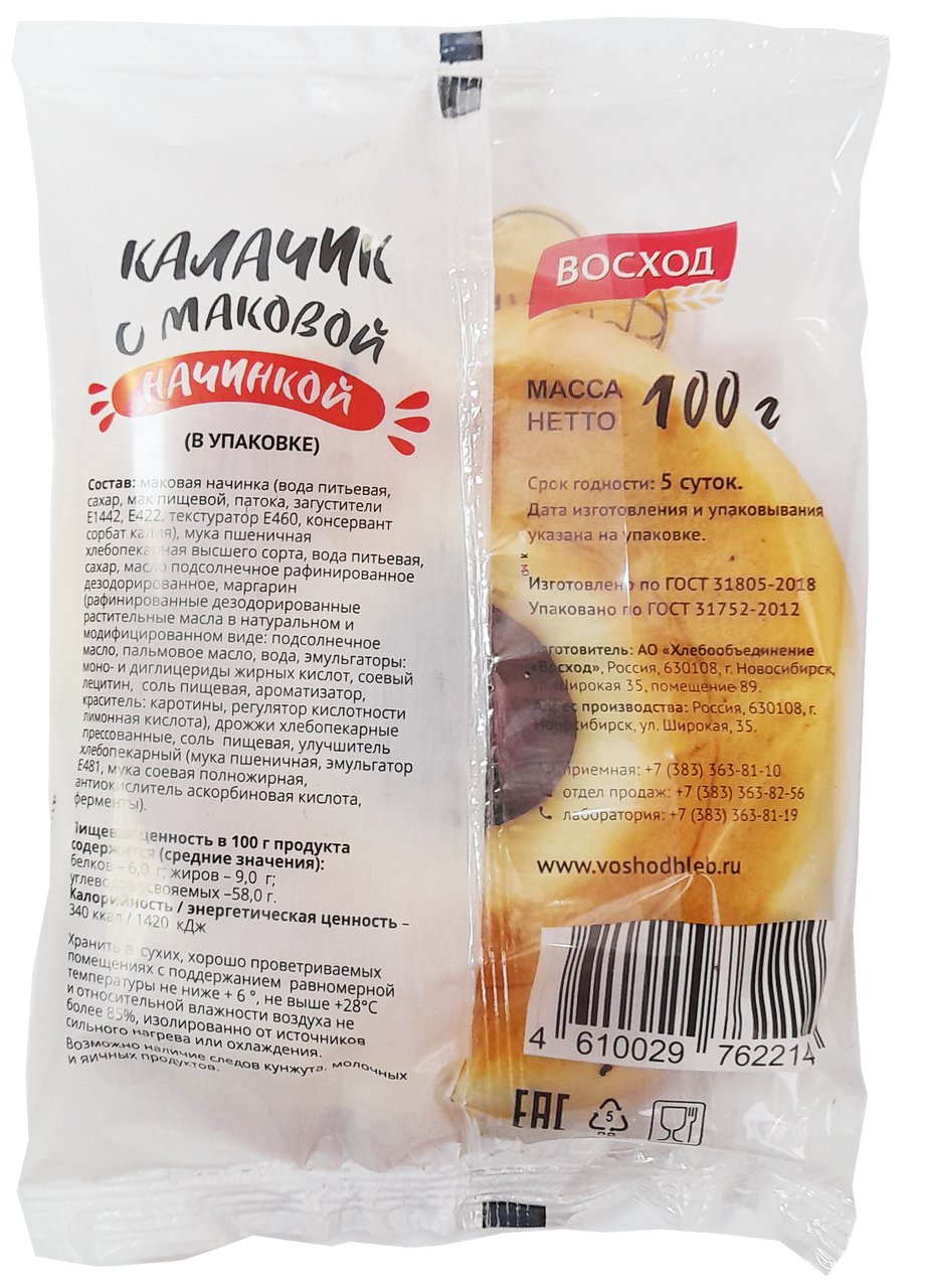 Маковая начинка (вода питьевая, сахар, мак пищевой, патока, загустители Е1442, Е422, текстуратор Е460, консервант сорбат калия), мука пшеничная хлебопекарная высшего сорта, вода питьевая, сахар, масло подсолнечное рафинированное дезодорированное, маргарин (рафинированные дезодорированные растительные масла в натуральном и модифицированном виде: подсолнечное масло, пальмовое масло, вода, эмульгаторы: моно - и диглицериды жирных кислот, соевый лецитин, соль пищевая, ароматизатор, краситель: каротины, регулятор кислотности лимонная кислота), дрожжи хлебопекарные прессованные, соль пищевая, улучшитель хлебопекарный (мука пшеничная, эмульгатор Е481, мука соевая, антиокислитель аскорбиновая кислота, ферменты).