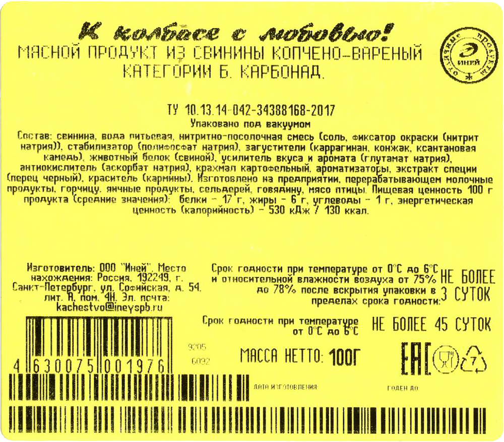 Свинина, вода питьевая, нитритно-посолочная смесь соль, фиксатор окраски нитрит натрия, стабилизатор полифосфат натрия, загустители каррагинан, конжак, ксантановая камедь, животный белок свиной, усилитель вкуса и аромата глутамат натрия, антиокислитель аскорбат натрия, крахмал картофельный, ароматизаторы, экстракт специи перец чёрный, краситель кармины.