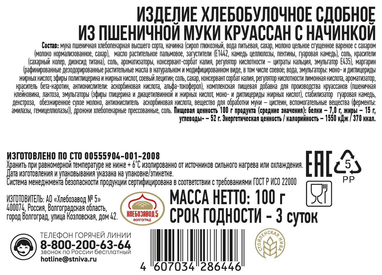 Мука пшеничная хлебопекарная высшего сорта, начинка сироп глюкозный, вода питьевая, сахар, молоко цельное сгущённое варёное с сахаром молоко нормализованное, сахар, масло растительное пальмовое, загустители Е1442, камедь целлюлозы, пектины, гуаровая камедь, соль, красители сахарный колер, диоксид титана, соль, ароматизаторы, консервант-сорбат калия, регулятор кислотности - цитраты кальция, эмульгатор Е435, маргарин рафинированные дезодорированные растительные масла в натуральном и модифицированном виде, в том числе соевое; вода, эмульгаторы: моно - и диглицериды жирных кислот, эфиры полиглицерина и жирных кислот, соевый лецитин; соль, сахар, консервант сорбат калия, регулятор кислотности лимонная кислота, ароматизатор, краситель бета-каротин, антиокислители: аскорбиновая кислота, альфа-токоферол, комплексная пищевая добавка для производства круассанов пшеничная клейковина, лактоза, эмульгаторы эфиры глицерина и диацетилвинной и жирных кислот, моно - и диглицериды жирных кислот, стабилизатор гуаровая камедь, декстроза, обезжиренное сухое молоко, антиокислитель аскорбиновая кислота, вещество для обработки муки - цистеин, вспомогательные вещества ферменты: амилазы, гемицеллюлазы, дрожжи хлебопекарные прессованные, соль.