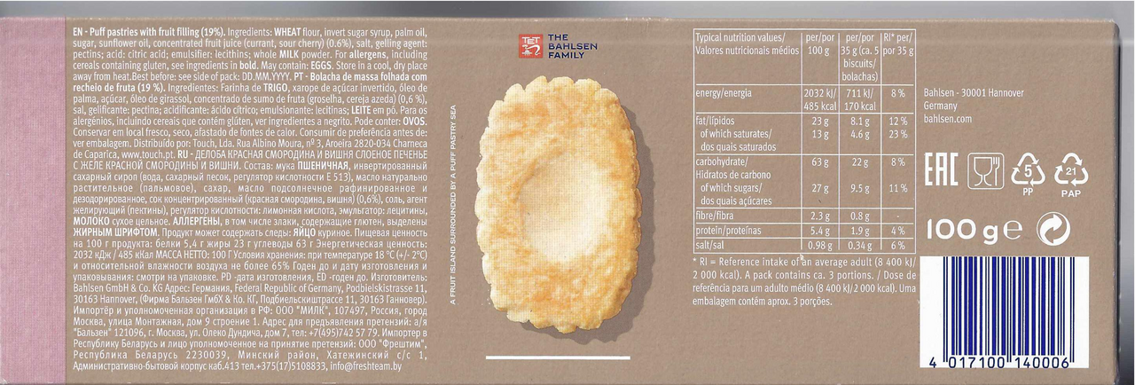 Печенье слоеное Bahlsen Deloba с красной смородиной и вишней, 100г