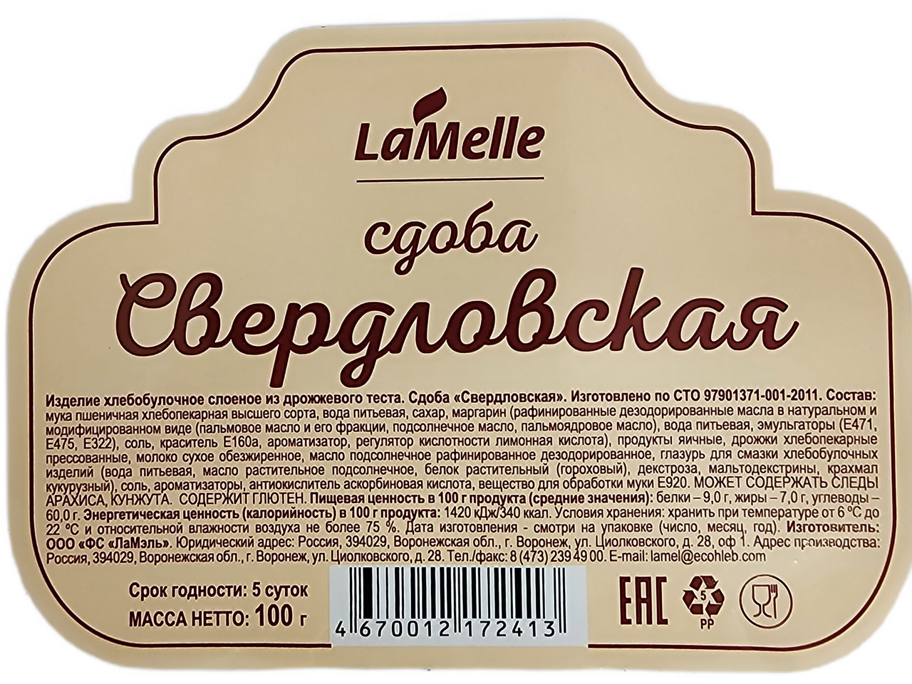 Мука пшеничная хлебопекарная высшего сорта, вода питьевая, сахар, маргарин (рафинированные дезодорированные масла в натуральном и модифицированном виде (пальмовое масло и его фракции, подсолнечное масло, пальмоядровое масло), вода питьевая, эмульгаторы (Е471, Е475, Е322), соль, краситель Е160а, ароматизатор, регулятор кислотности лимонная кислота), продукты яичные, дрожжи хлебопекарные прессованные, молоко сухое обезжиренное, масло подсолнечное рафинированное дезодорированное, глазурь для смазки хлебобулочных изделий (вода питьевая, масло растительное подсолнечное, белок растительный (гороховый), декстроза, мальтодекстрины, крахмал кукурузный), соль, ароматизаторы, антиокислитель аскорбиновая кислота, вещество для обработки муки Е920.