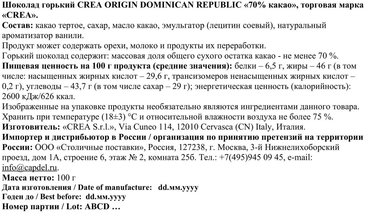 Шоколад Crea - это плиточный шоколад снежной кремовой текстурой. Погрузитесь вмир изысканного вкуса сшоколадом Crea, изготовленным излучших какао-бобов. Этот шоколад отличается не только невероятным вкусом, но иароматом натурального качественного шоколада. Подарите себе исвоим близким моменты истинного наслаждения сшоколадом, который сочетает всебе традиции истрасть ккачеству. Этот шоколад станет отличным дополнением ваших сладких перекусов и идеальным лакомством к чашечке чая. Погрузитесь в богатый, насыщенный вкус, который создается с использованием отборных какао-бобов из Доминиканской Республики.Шоколад Crea не только порадует вас, но и станет прекрасным подарком для ваших близких. Благодаря своему качеству и неповторимому вкусу, он идеально подойдет для новогодних подарков, а также станет изысканным сюрпризом на день рождения. Упакованный в стильную упаковку, он выглядит стильно и элегантно, что делает его прекрасным решениям для подарков на любые торжества.Любите ли вы горький шоколад или ищете что-то особенное для друзей и родных, этот продукт не разочарует. Превосходный вкус и аромат делают его идеальным для совместных чаепитий или как угощение на праздничном столе.