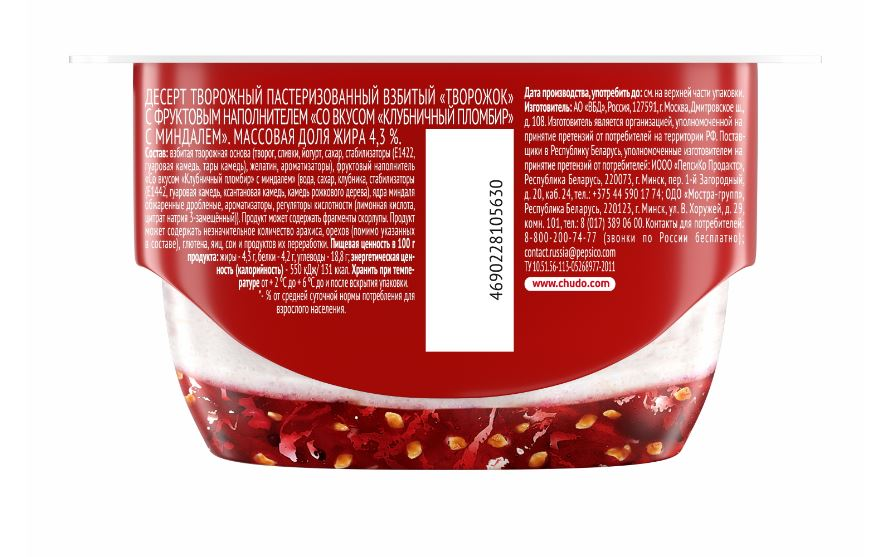 Приготовлен по классическому рецепту. Он полностью состоит из натуральных ингредиентов: свежего творога, фруктового наполнителя со вкусом клубничного пломбира и кусочков миндаля. Такой десерт порадует детей и их родителей, его удобно брать с собой в дорогу.