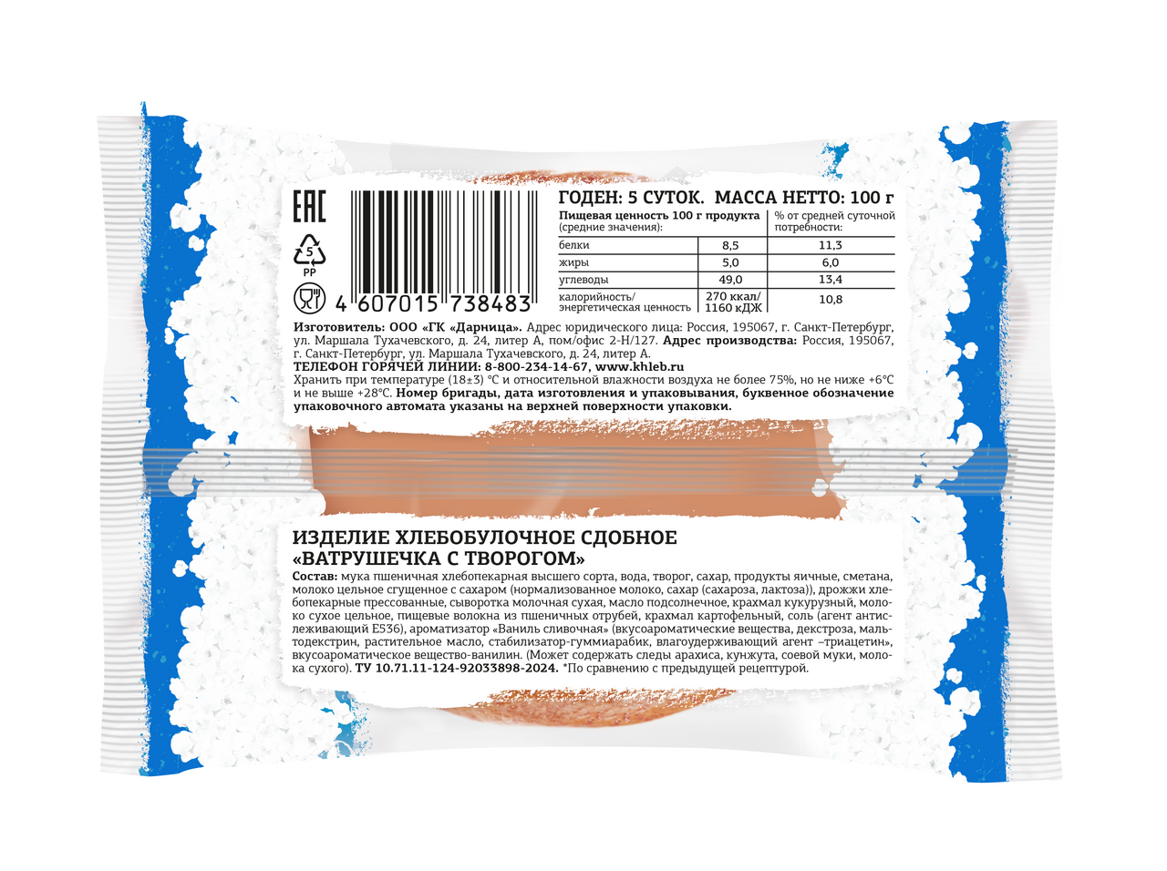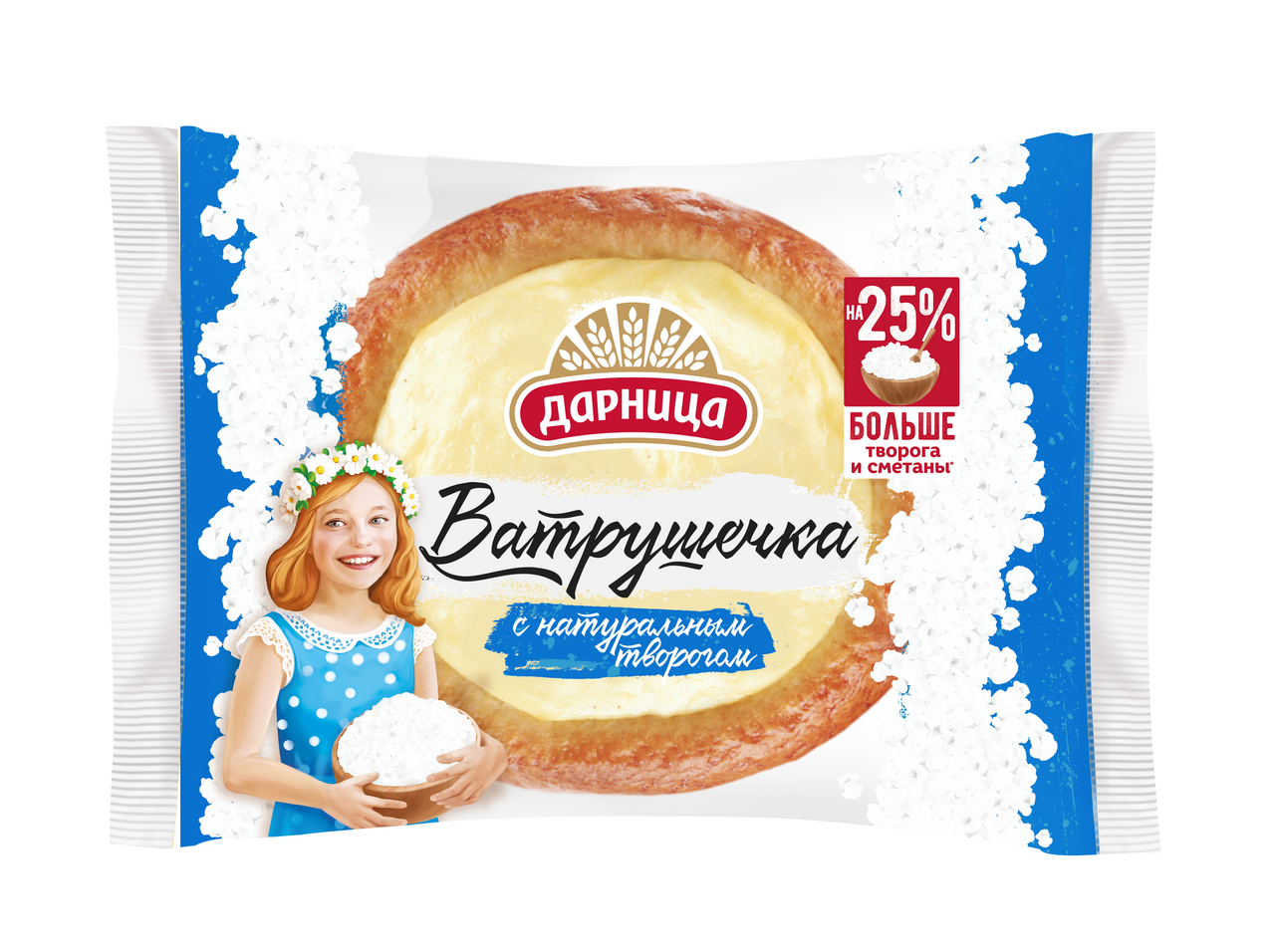 Мука пшеничная хлебопекарная высшего сорта, вода, творог, сахар, продукты яичные, сметана, молоко цельное сгущенное с сахаром (нормализованное молоко, сахар (сахароза, лактоза)), дрожжи хлебопекарные прессованные, сыворотка молочная сухая, масло подсолнечное, крахмал кукурузный, молоко сухое цельное, пищевые волокна из пшеничных отрубей, крахмал картофельный, соль (агент антислеживающий E536), ароматизатор Ваниль сливочная (вкусоароматические вещества, декстроза, мальтодекстрин, растительное масло, стабилизатор - гуммиарабик, влагоудерживающий агент - триацетин, вкусоароматическое вещество ванилин.