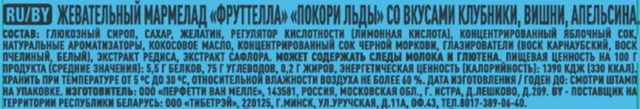 Встречайте новую линейку Жевательного мармелада Fruittella Покори Льды, ассорти вкусов с фруктовым соком, пакет 100 грамм - это фигурный мармелад со вкусом фруктов, изготовленный в оригинальной форме полярных зверей. В жевательных мармеладках Fruittella Покори Льды собраны любимые многими вкусы апельсина и клубники, а также новый вкус - вишня! Мармеладки Fruittella с добавлением фруктового сока и не содержат искусственных красителей и ароматизаторов. Компактная упаковка жевательного мармелада Покори Льды с легкостью помещается в рюкзаке. Ее удобно взять с собой на учебу и подкрепиться любимым мармеладом в перерыве между занятиями, или поделиться им с друзьями во время прогулки. Теперь можно и поиграть! Увлекательная игра с интересными фактами и вопросами про полярных зверей по QR-коду на упаковке! Вкусно и интересно! Ищите жевательный мармелад? Выбирайте мармелад Fruittella: его яркий и сочный фруктовый вкус точно не оставит вас равнодушным! Делитесь и наслаждайтесь разнообразием вкусов! Скажите Да! вместе с Fruittella.