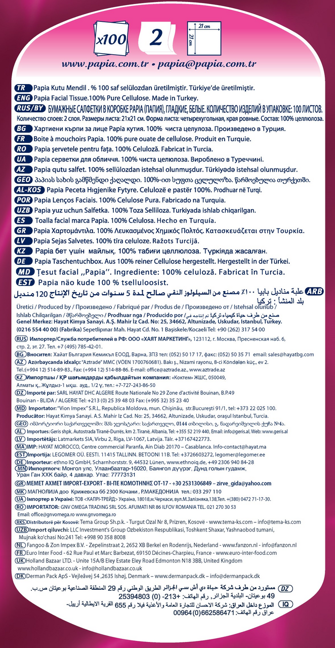 Салфетки в коробках Papia можно использовать дома или взять с собой в офис или машину. Нежные и мягкие, они удивят вас не только своим высоким качеством, но и внешним видом - красивая упаковка никого не оставит равнодушным и станет украшением вашего интерьера. Двухслойные салфетки изготовлены из 100% целлюлозы. Салфетки в коробках Papia можно использовать дома или взять с собой в офис или машину.
