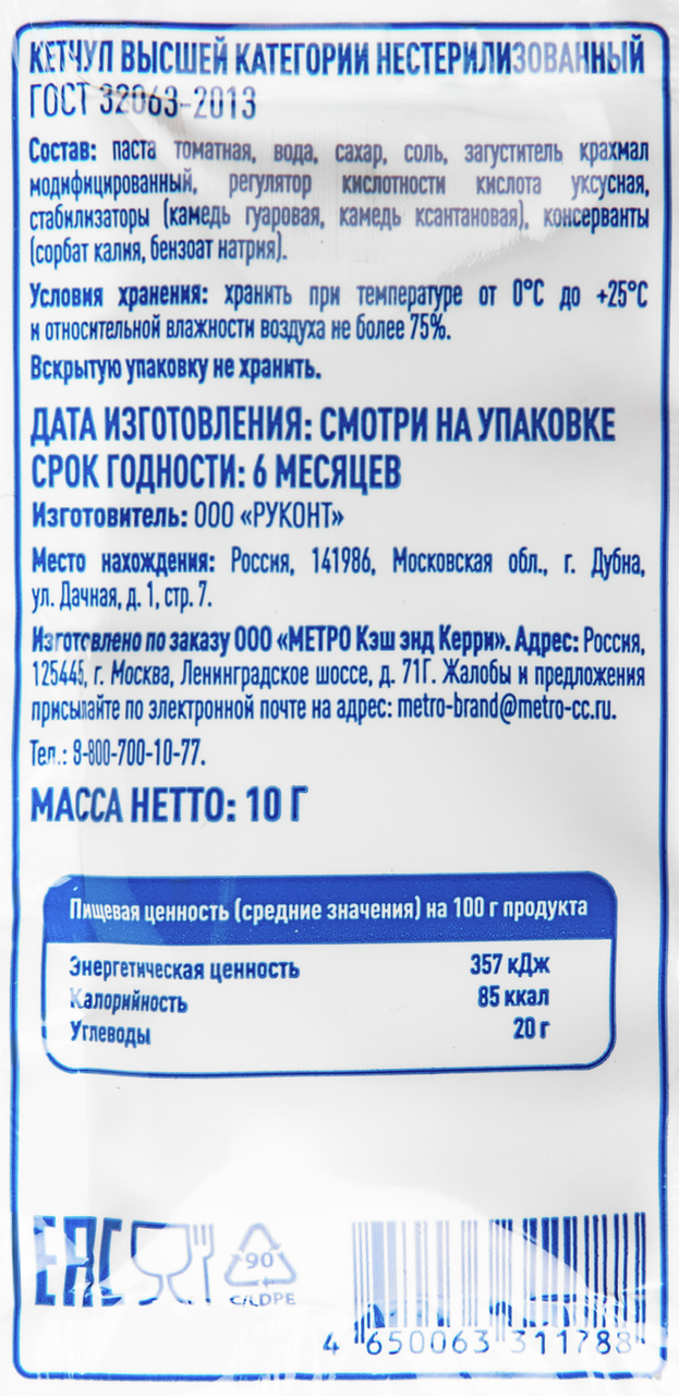 Паста томатная, вода, сахар, соль, загуститель крахмал модифицированный, регулятор кислотности кислота уксусная, стабилизаторы (камедь гуаровая, камедь ксантановая), консерванты (сорбат калия, бензоат натрия).
