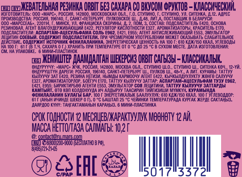 Жевательная резинка Orbit Mini классический без сахара, 10.2г x 20 шт - жевательная резинка без сахара с освежающим классическим вкусом. Жевательная резинка помогает заботиться о зубах: удаляет остатки пищи, способствует уменьшению зубного налета, нейтрализует вредные кислоты и усиливает процесс реминерализации эмали. Orbit mini Классический освежает мысли и позволяет сконцентрироваться на важных задачах, будь то работа или учеба. Жевательная резинка Orbit не прилипает к зубам, освежает дыхание и долго сохраняет насыщенный вкус. В упаковке 6 пластинок жевательной резинки Orbit mini Классический. У каждого из нас бывают моменты, когда ты сам не свой и кажется, что все идет не так. Накрутил себя? Завал на работе или учебе? Жуй, когда нужно ско��центрироваться и принять решение. Жуй, чтобы выдохнуть и расслабиться. Это жевательная резинка без сахара, которая дарит внутреннее ощущение уверенности, так необходимое нам в личной жизни, профессиональных и даже мелких бытовых ситуациях. Жевательная резинка без сахара помогает поддерживать здоровье зубов: удаляет остатки пищи, способствует уменьшению зубного налета, нейтрализует вредные кислоты, усиливает процесс реминерализации эмали.
