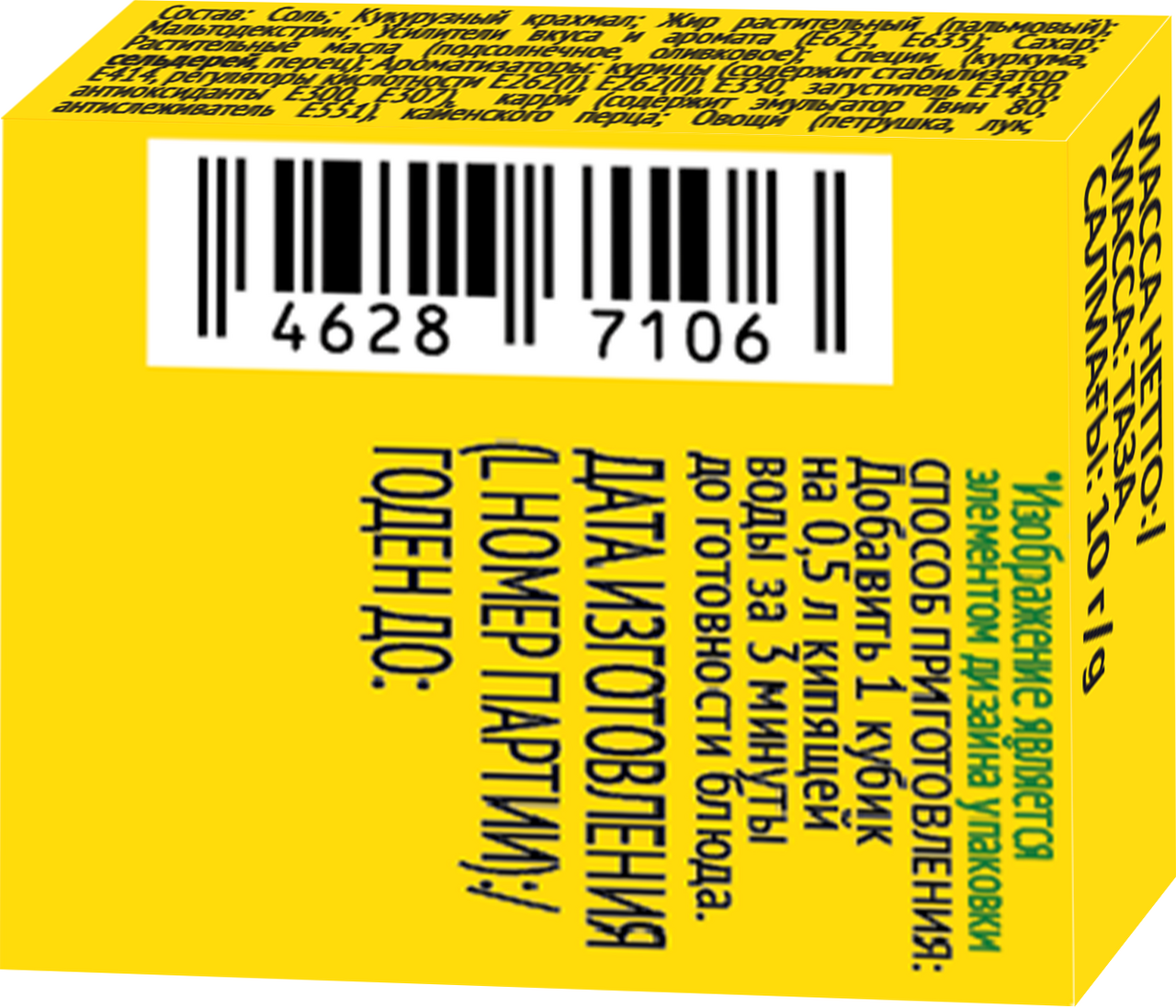 Соль, усилители вкуса и аромата е621, е635; кукурузный крахмал; растительные масла пальмовое, подсолнечное, оливковое; мальтодекстрин; сахар; ароматизаторы содержат лактозу, молочную сыворотку; регулятор кислотности е330; петрушка; красители е150d, е150а; овощи; мясо говядины содержит антиокислитель е392; соевый соус содержит пшеницу; антиокислитель е306.