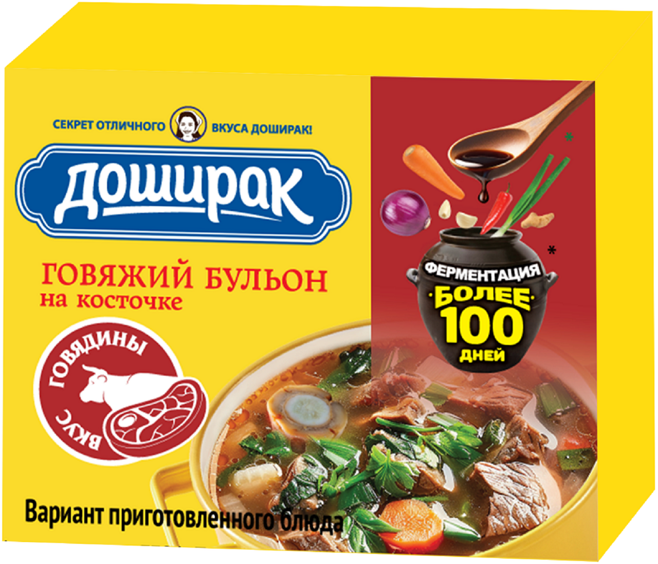 Бульон Доширак говяжий на косточке, 10г x 48 шт - это универсальная база для приготовления любимых блюд - от соуса и супа до жаркого и овощного рагу. В состав говяжьего на косточке бульона Доширак входят уникальные ингредиенты, изготовленные по специальной технологии - ферментации более 100 дней. Ферментация - это процесс обогащения продукта живыми бактериями в результате брожения. Ферментированные продукты обладают полезными свойствами, добавляют особый вкус и изюминку блюду.