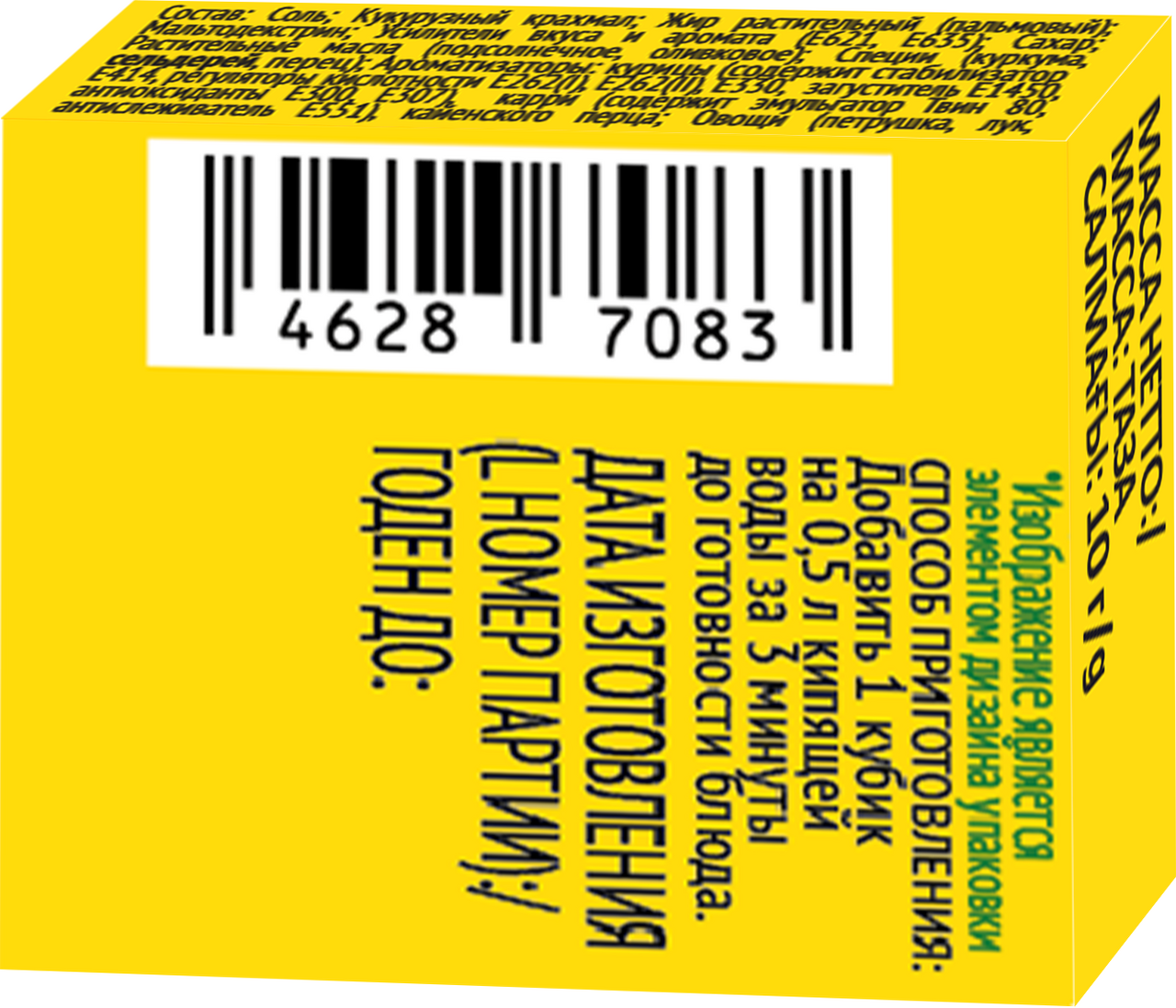 Соль, кукурузный крахмал; усилители вкуса и аромата е621, е635; растительные масла пальмовое, подсолнечное, оливковое; мальтодекстрин; ароматизаторы содержат антикомкователь е551; красители е150d, е150а; овощи петрушка, лук, морковь; грибы; сельдерей; перец; соевый соус содержит пшеницу; антиокислитель е306.