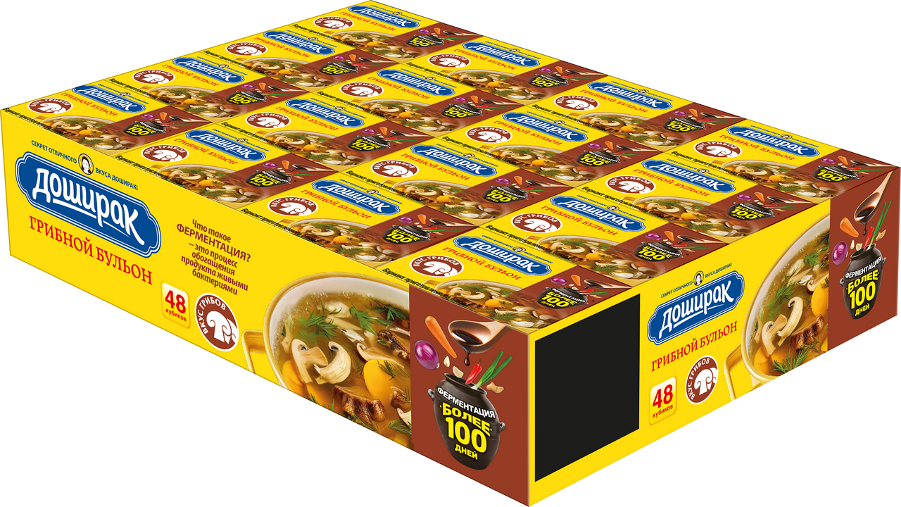 Бульонные кубики Доширак - это универсальная база для приготовления любимых блюд - от соуса и супа до жаркого и овощного рагу. В состав грибного бульона Доширак входят уникальные ингредиенты, изготовленные по специальной технологии - ферментации более 100 дней. Ферментация - это процесс обогащения продукта живыми бактериями в результате брожения. Ферментированные продукты обладают полезными свойствами, добавляют особый вкус и изюминку блюду.