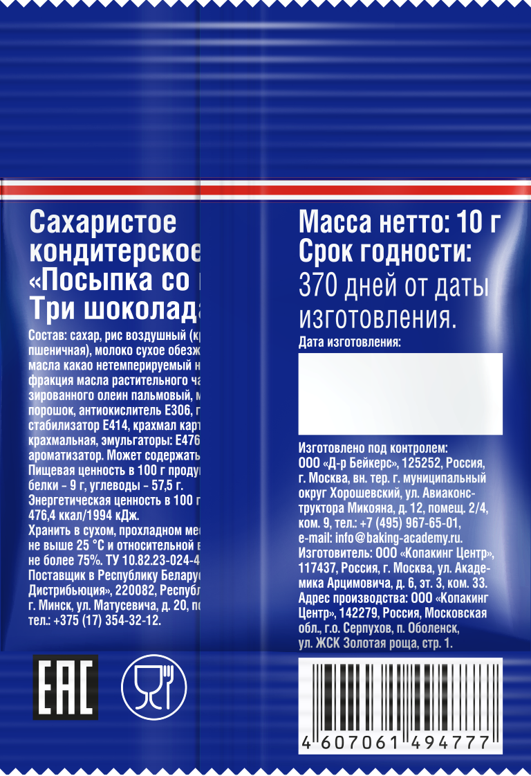 Посыпка Dr.Bakers Три шоколада, 10 г представляет собой украшения небольших размеров. С ее помощью можно воплотить в реальность различные фантазии, создав красочные и насыщенные рисунки, логотипы и даже надписи. Благодаря таким сладким фигуркам десерты приобретают завершенность. Ими можно украсить торты, пирожные, кексы, куличи. Для удобства нанесения на поверхность можно воспользоваться шаблонами.