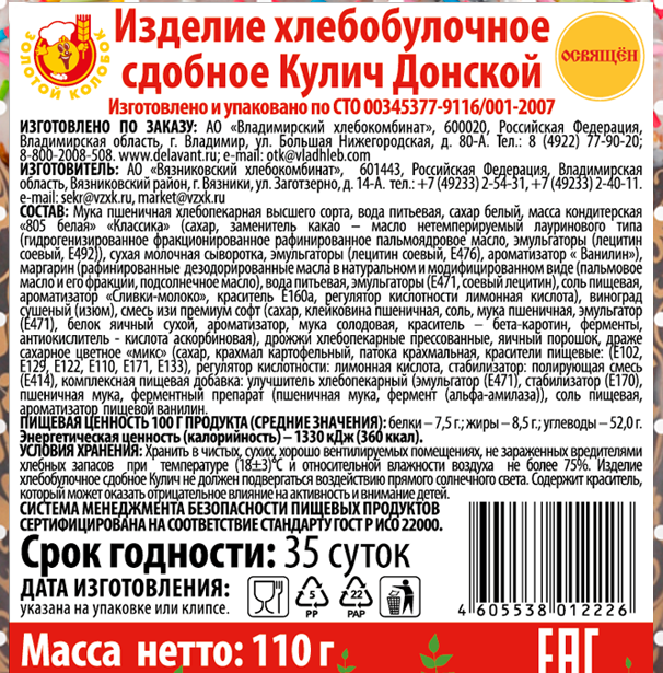 Кекс Донской от бренда Золотой колобок – вкусное тающее угощение, которое никого не оставит равнодушным. Оно готовится из ароматного теста с добавлением помадки и отборного изюма. Десерт буквально тает во рту. Нежнейший кекс Донской с оригинальным ароматом подарит настоящее гастрономическое удовольствие самому взыскательному гурману.