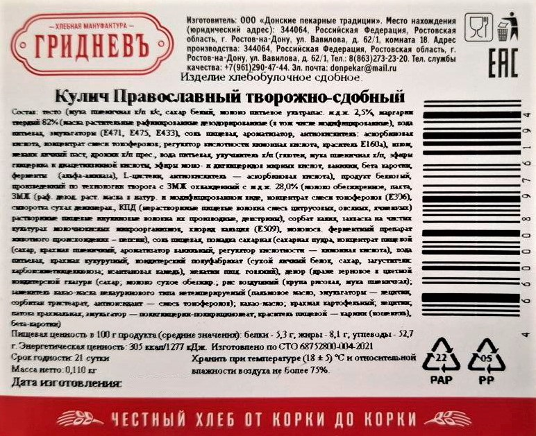 Кулич Гридневъ Православный творожно-сдобный, 110г