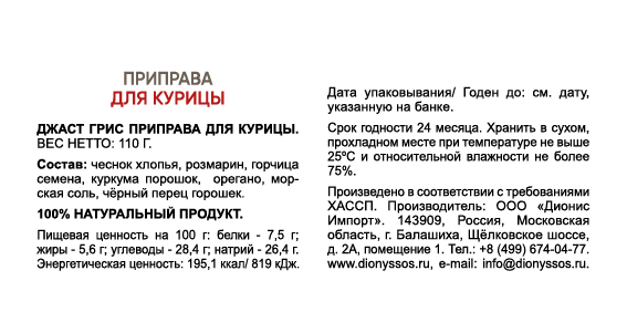 Чеснок хлопья, розмарин, горчица семена, куркума порошок, орегано, морская соль, черный перец горошек.