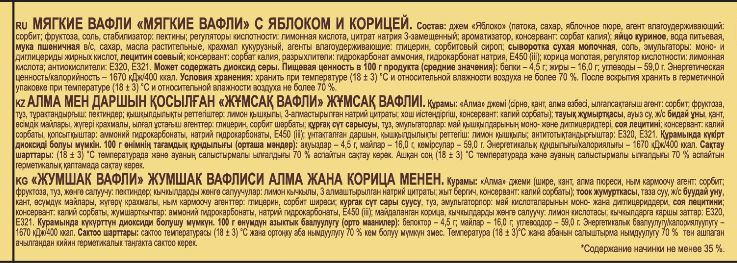 Джем Яблоко (патока, сахар, яблочное пюре, агент влагоудерживающий: сорбит; фруктоза, соль, стабилизатор: пектины; реryляторы кислотности: лимонная кислота, цитрат натрия 3-замещенный; ароматизатор, консервант: сорбат калия); яйцо куриное, вода питьевая, мука пшеничная высший сорт, сахар, масла растительные, крахмал кукурузный, агенты влагоудерживающие: глицерин, сорбитовый сироп; сыворотка сухая молочная, соль, эмульгаторы: моно- и диглицериды жирных кислот, лецитин соевый; консервант: сорбат калия, разрыхлители: гидрокарбонат аммония, гидрокарбонат натрия, Е450 (iii); корица молотая, регулятор кислотности: лимонная кислота; антиокислители: Е320, Е321. Может содержать диоксид серы.