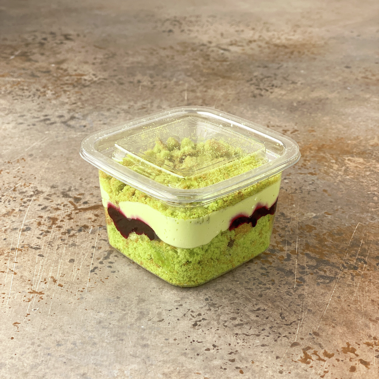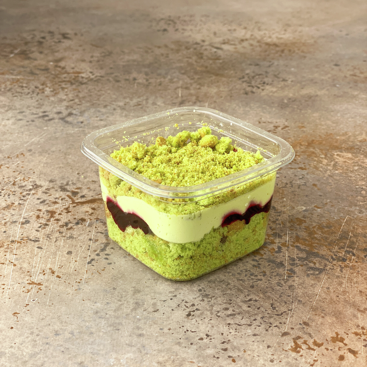 Фисташковый бисквит, сырный крем с фисташкой, начинка из смородины.