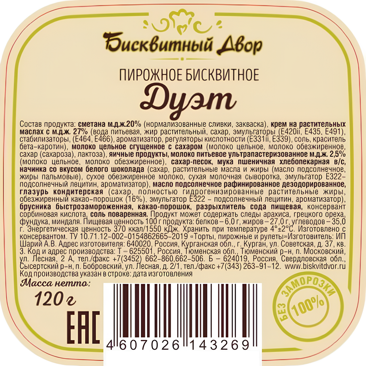 Сметана 20% жирн, сахар, мука пшеничная хлебопекарная в/с, яйцепродукты, паста шоколадная (растительные масла и жиры, сухое обезжиренное молоко, порошок из молочной сыворотки), молоко цельное 3,2 % жирность, крахмал кукурузный, сухое обезжиренное молоко, масло растительное, какао-порошок, брусника свежемороженая, разрыхлитель – Е500, консервант – сорбиновая кислота.
