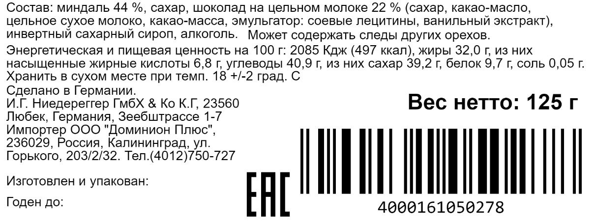Миндаль 44%, сахар, цельномолочный шоколад 22% (сахар, какао-масло, цельное сухое молоко, какао тертое, эмульгатор: соевый лецитин, экстракт ванили), инвертный сахарный сироп, спирт. может содержать следы других орехов.