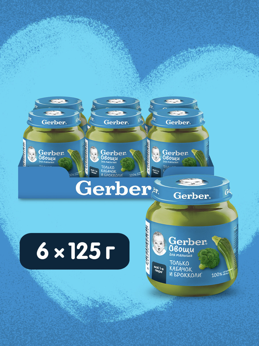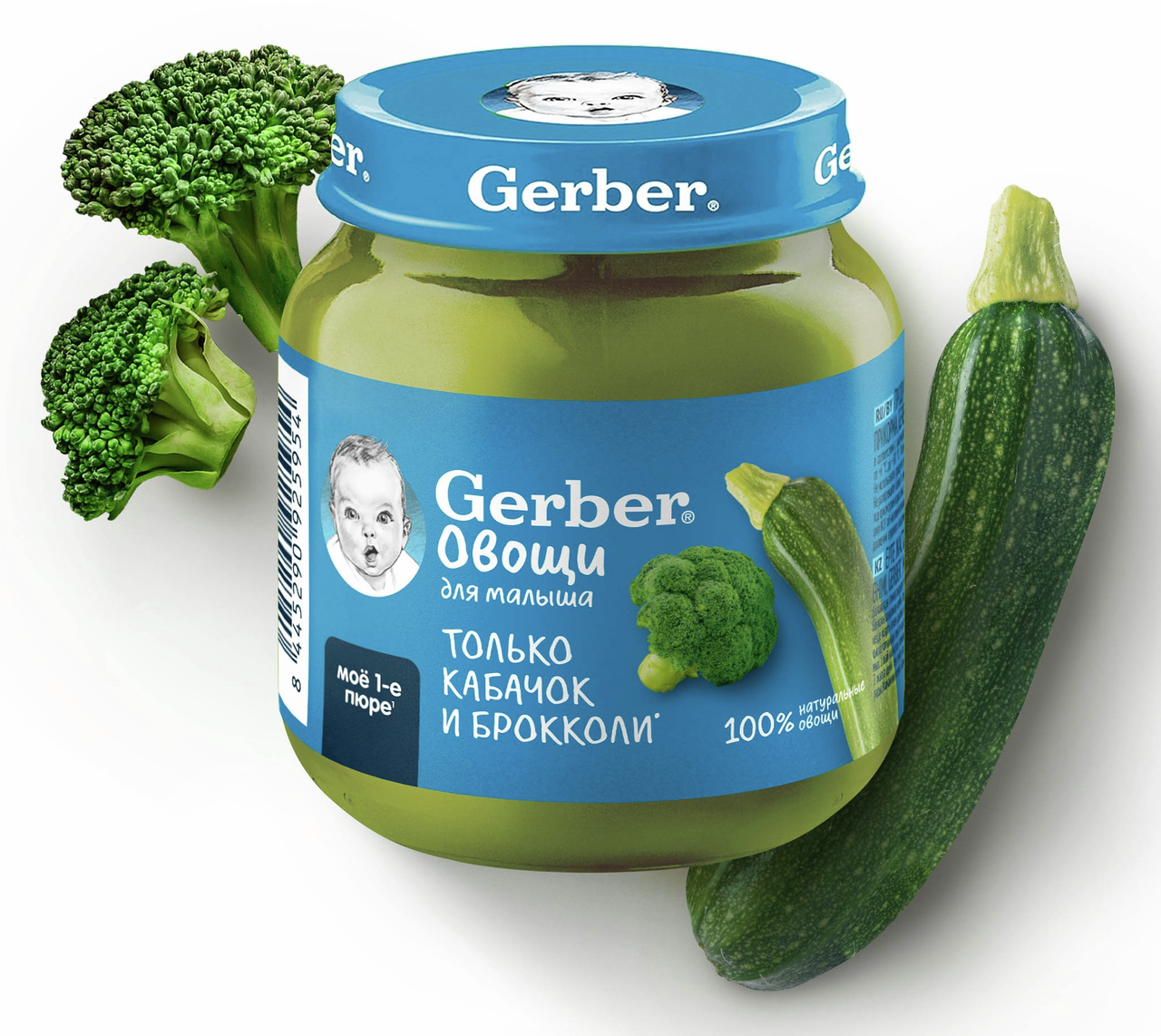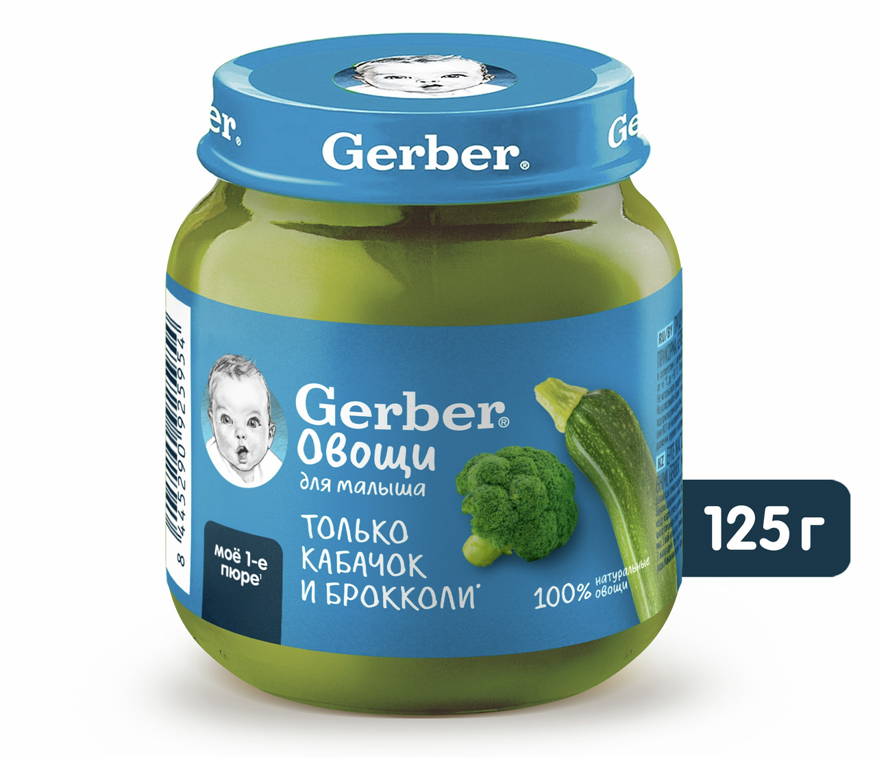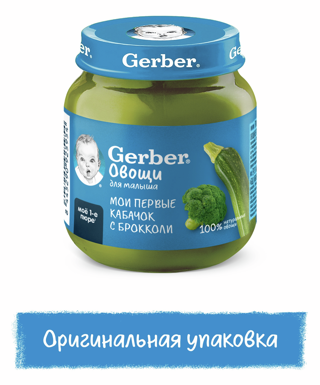 Продукт детского питания для детей раннего возраста, продукт прикорма, овощное пюре Кабачок и Брокколи. Для питания детей с 5 месяцев. Гомогенизированное. Стерилизованное. Готово к употреблению. Мы предъявляем самые строгие требования к качеству наших продуктов, что позволяет нам выбрать лучшие ингредиенты, которые станут пюре Gerber(r): Стандарты качества Gerber по многим параметрам превосходит государственные стандарты качества, принятые в разных странах Наши продукты проходят более 120 проверок на качество на всех этапах производства Фрукты и овощи выращены на полях проверенных поставщиков Ведь здоровье Вашего малыша - наш главный приоритет. Только 100% натуральные овощи. Любовь и забота в каждой ложечке. Изготовлено без использования генетически модифицированных ингредиентов, искусственных консервантов, красителей и ароматизаторов. Без добавления крахмала, соли и сахара. Важное примечание: идеальной пищей для грудного ребенка является молоко матери. Всемирная организация здравоохранения рекомендует исключительно грудное вскармливание в первые шесть месяцев и последующее введение прикорма при продолжении грудного вскармливания. Компания Нестле поддерживает данную рекомендацию. Для принятия решения о сроках и способе введения данного продукта в рацион ребенка необходима консультация специалиста.
