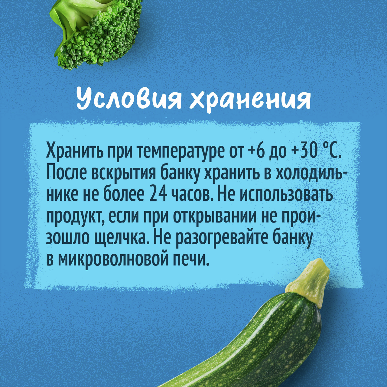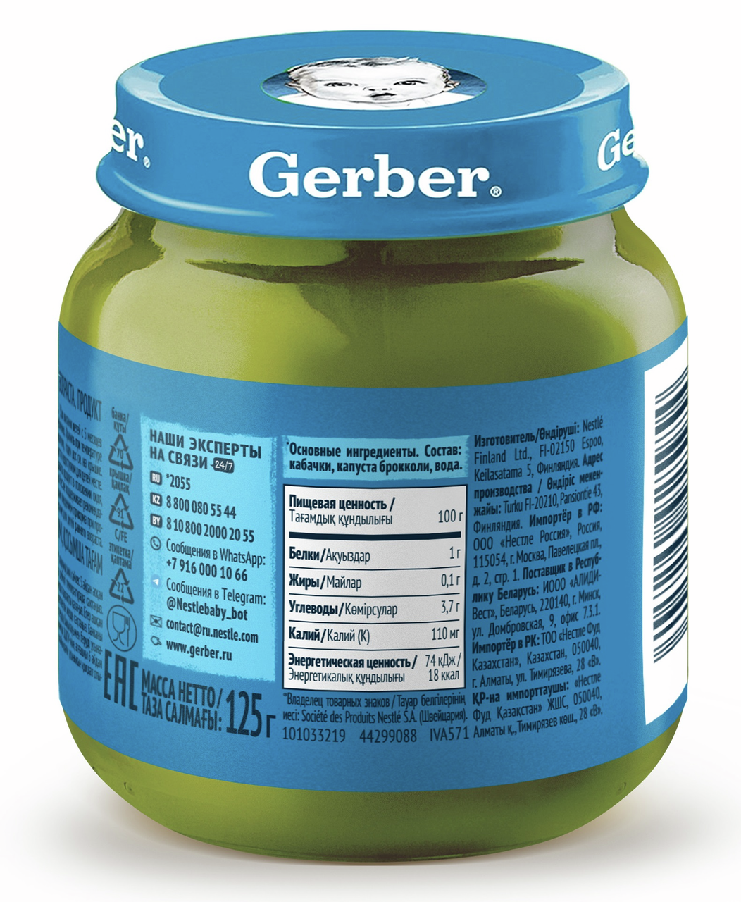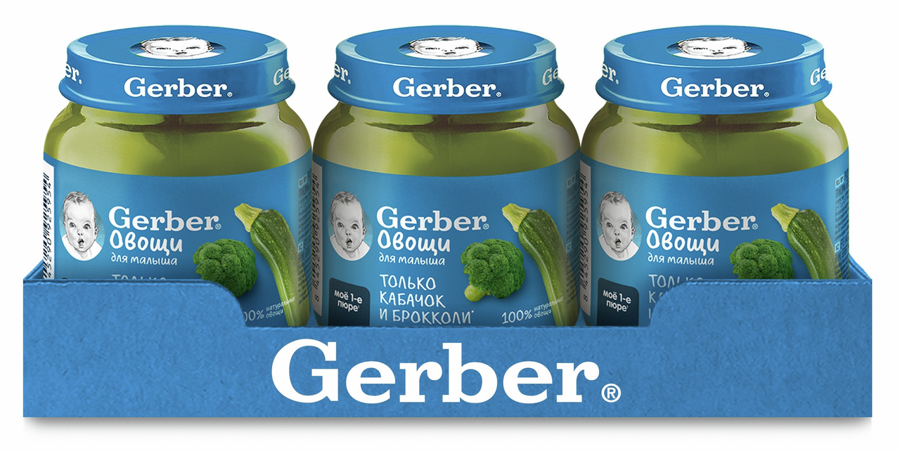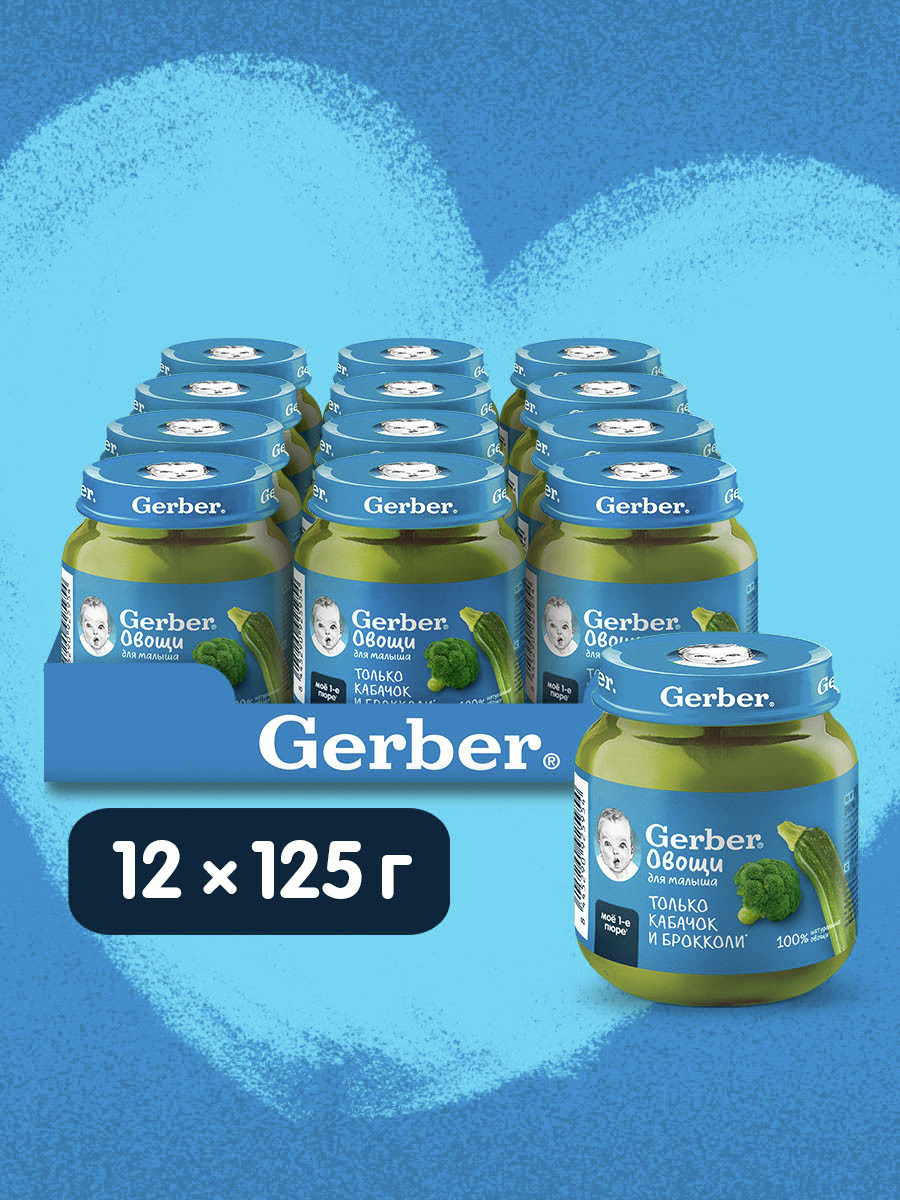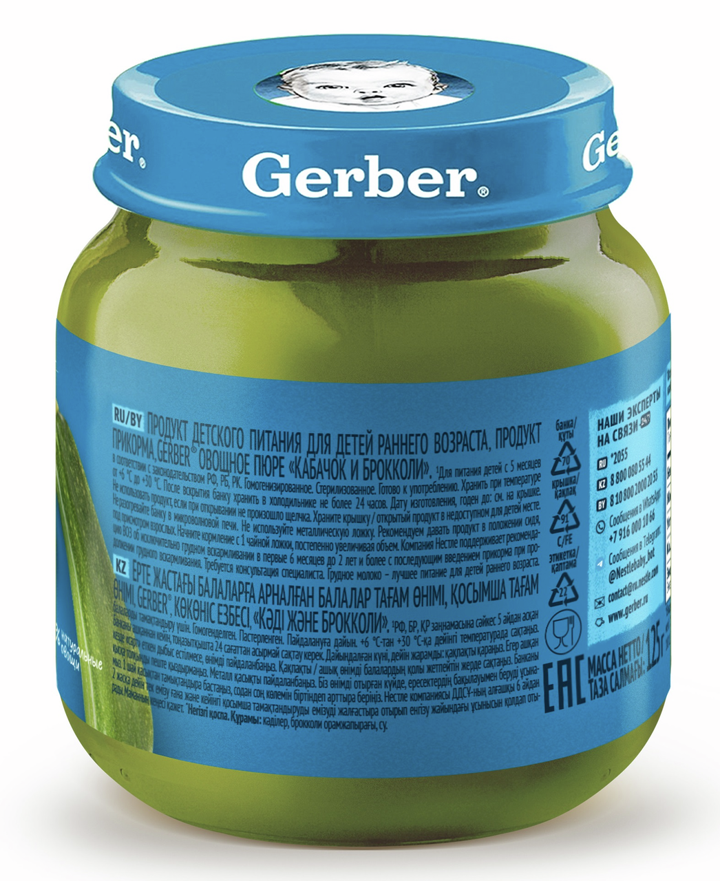 Продукт детского питания для детей раннего возраста, продукт прикорма, овощное пюре Кабачок и Брокколи. Для питания детей с 5 месяцев. Гомогенизированное. Стерилизованное. Готово к употреблению. Мы предъявляем самые строгие требования к качеству наших продуктов, что позволяет нам выбрать лучшие ингредиенты, которые станут пюре Gerber(r): Стандарты качества Gerber по многим параметрам превосходит государственные стандарты качества, принятые в разных странах Наши продукты проходят более 120 проверок на качество на всех этапах производства Фрукты и овощи выращены на полях проверенных поставщиков Ведь здоровье Вашего малыша - наш главный приоритет. Только 100% натуральные овощи. Любовь и забота в каждой ложечке. Изготовлено без использования генетически модифицированных ингредиентов, искусственных консервантов, красителей и ароматизаторов. Без добавления крахмала, соли и сахара. Важное примечание: идеальной пищей для грудного ребенка является молоко матери. Всемирная организация здравоохранения рекомендует исключительно грудное вскармливание в первые шесть месяцев и последующее введение прикорма при продолжении грудного вскармливания. Компания Нестле поддерживает данную рекомендацию. Для принятия решения о сроках и способе введения данного продукта в рацион ребенка необходима консультация специалиста.