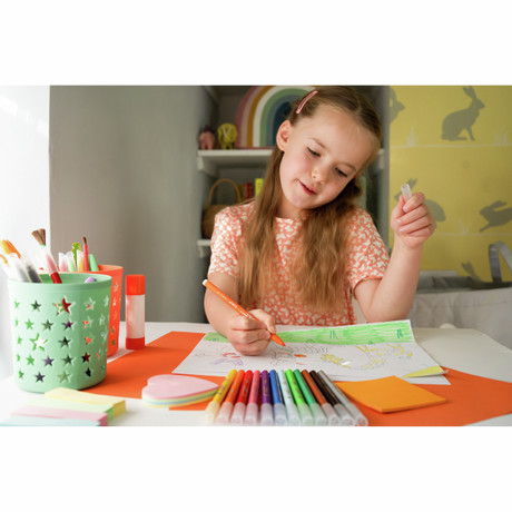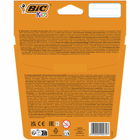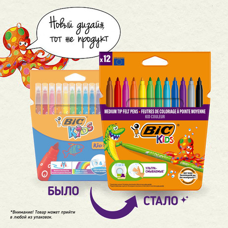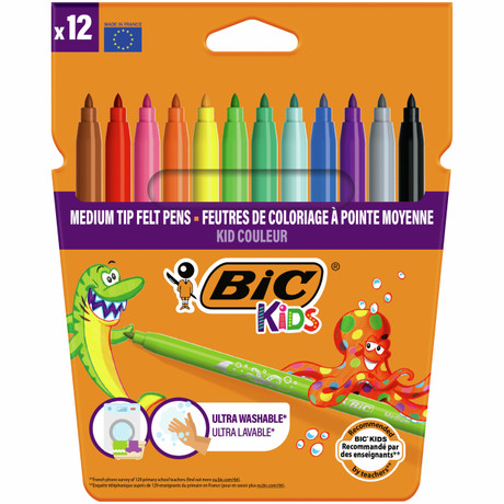 В линейке BIC Kids представлены принадлежности для рисования и творчества, специально разработанные для детей: простые, лёгкие и безопасные в использовании. Фломастеры BIC Kids Kid Couleur подойдут детям от 5 лет и старше в ежедневных творческих проектах. Фломастеры с отличными характеристиками представлены в 12 ярких цветах, благодаря которым рисунки просто оживают на бумаге. Средний фиксированный пишущий узел не даст стержню провалиться даже при сильном детском нажатии, позволяя юным художникам не только рисовать замысловатые узоры, но и раскрашивать большие фигуры. Не волнуйтесь, если малыши разрисуют всё вокруг: фломастеры легко смываются с кожи и с большинства тканей. Компания BIC производит эти надёжные и долговечные детские фломастеры на собственных заводах, основываясь на проверенной временем экспертизе. Вам понравятся BIC Kids Kid Couleur - без сомнения!