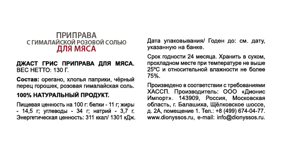 Приправа с гималайской солью для мяса Just Greece - разработана на основе традиционных рецептов греческой кухни. Специальная смесь пряностей, трав и сушеных овощей придаст блюдам из курицы или индейки неповторимый вкус и аромат. Рекомендации: смелите смесь на мясо непосредственно перед приготовлением. Также рекомендуется для натирания (маринования) мяса за 20-30 минут перед жаркой, тушением или запеканием.