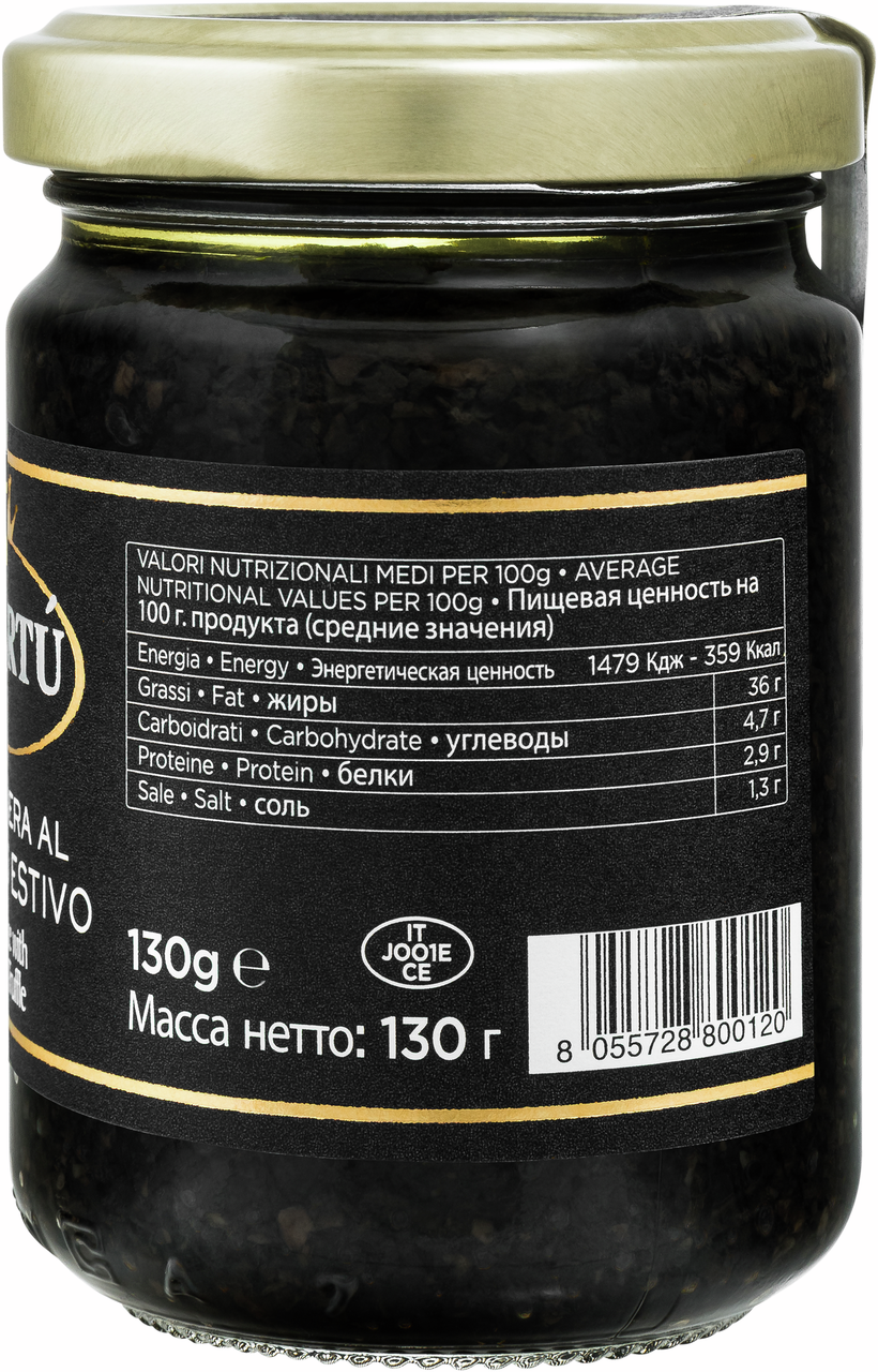 Грибы шампиньоны (Agaricus bisporus) 75 %, подсолнечное масло рафинированное, трюфель черный (Tuber aestivum Vitt.) 5%, черные оливки, грибы белые (Boletus edulis e rel.gruppo), соль, сахар, перец, чернила каракатицы 1%, ароматизатор Экстракт черного трюфеля, ароматизаторы натуральные.