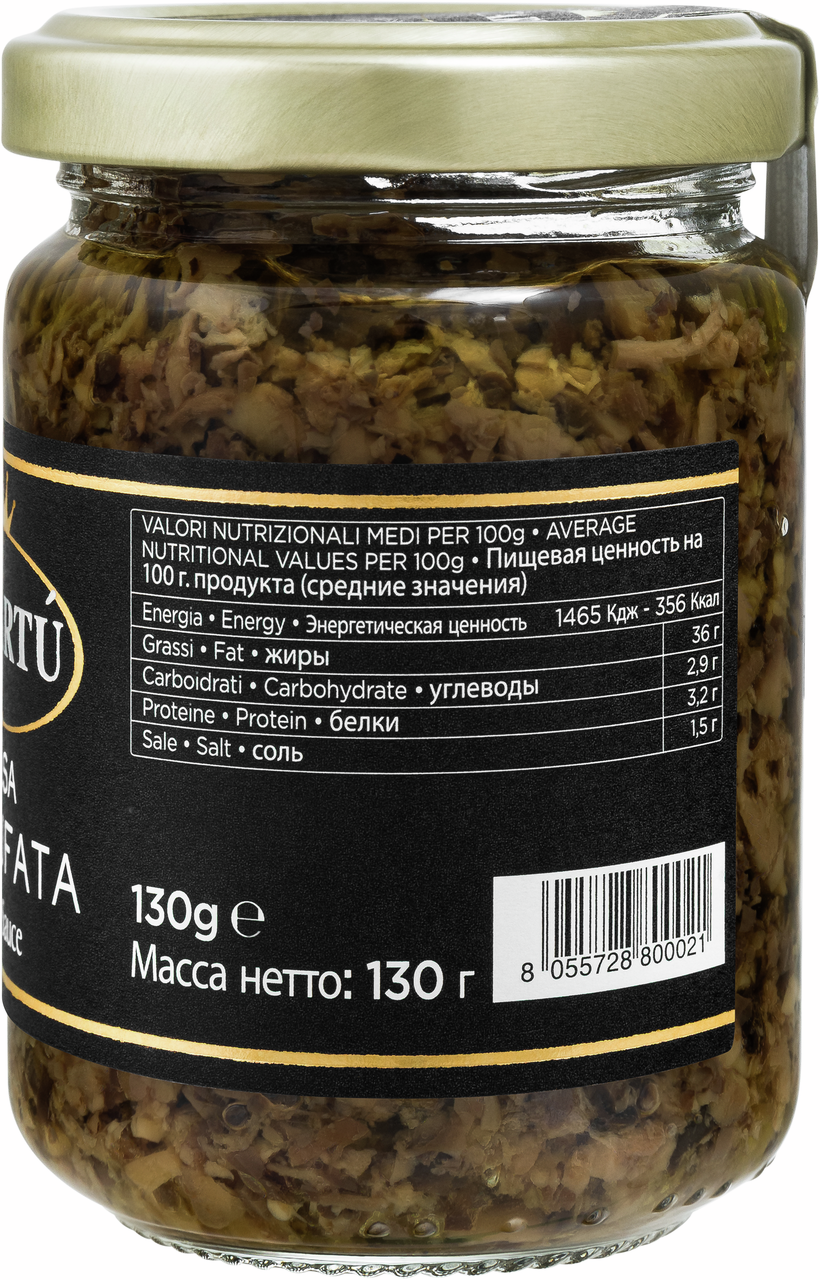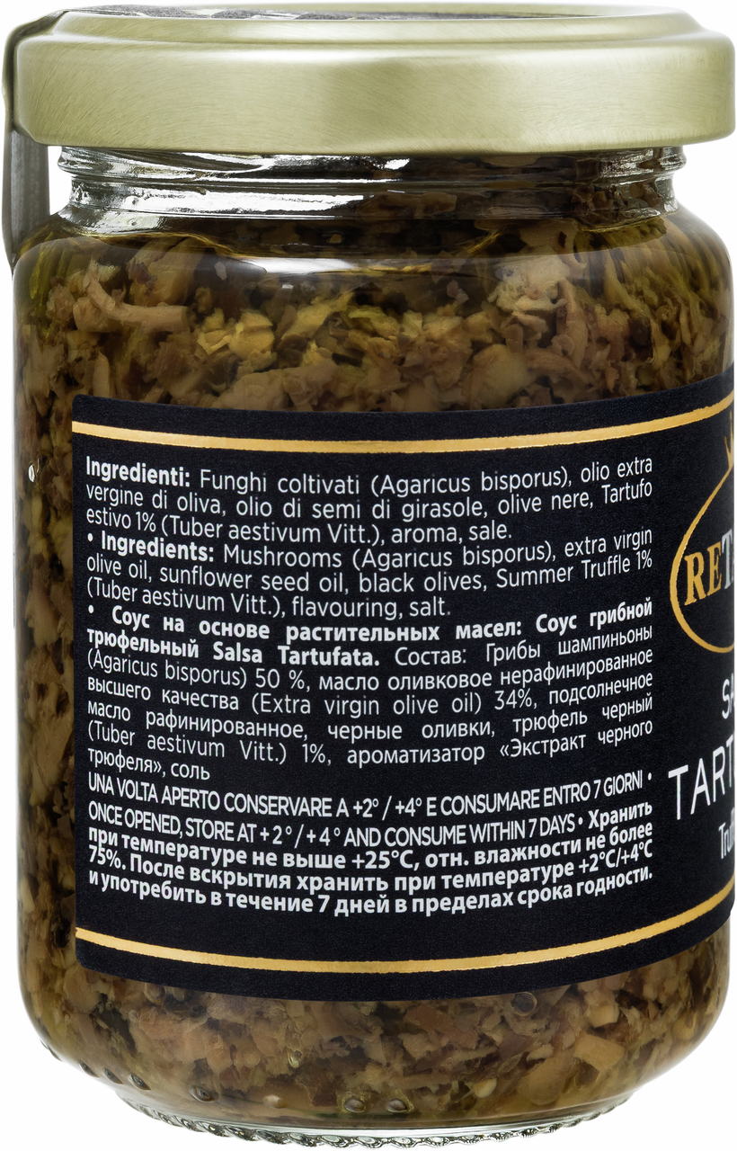 Грибы шампиньоны (Agaricus bisporus) 50 %, масло оливковое нерафинированное высшего качества (Extra virgin olive oil) 34%, подсолнечное масло 10%, черные оливки 3%, трюфель черный (Tuber aestivum Vitt.) 1%, ароматизатор Экстракт черного трюфеля 1%, соль.