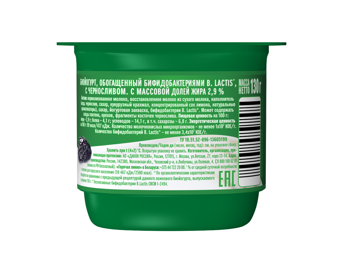 Нормализованное молоко, восстановленное молоко из сухого молока, наполнитель (вода, чернослив, сахар, кукурузный крахмал, концентрированный сок лимона, натуральные ароматизаторы), сахар, йогуртовая закваска, бифидобактерии B. Lactis*. Может содержать следы глютена, орехов, фрагменты косточек чернослива. Количество молочнокислых микроорганизмов – не менее 1х107 КОЕ/г. Количество бифидобактерий B. Lactis* – не менее 3,4х107 КОЕ/г.