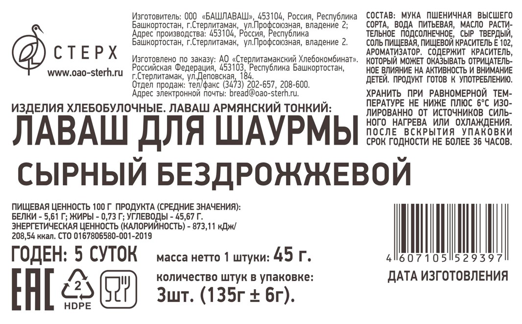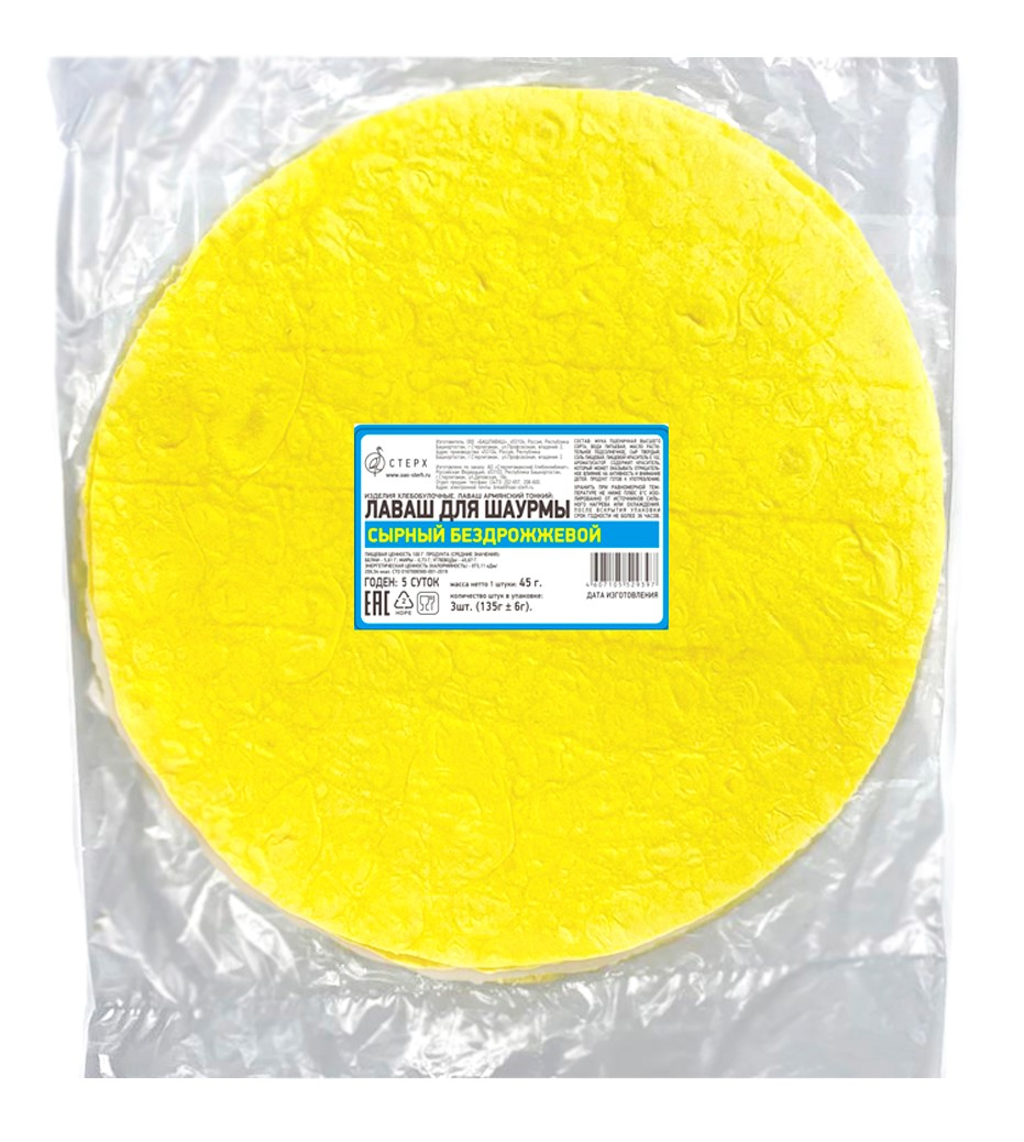 Тонкий лаваш из пшеничной муки высшего сорта с сырным вкусом. Идеально подходит для приготовления рулетов, шаурмы и других блюд.