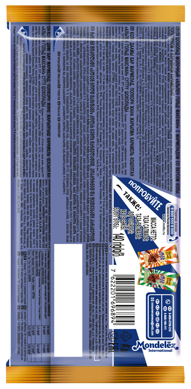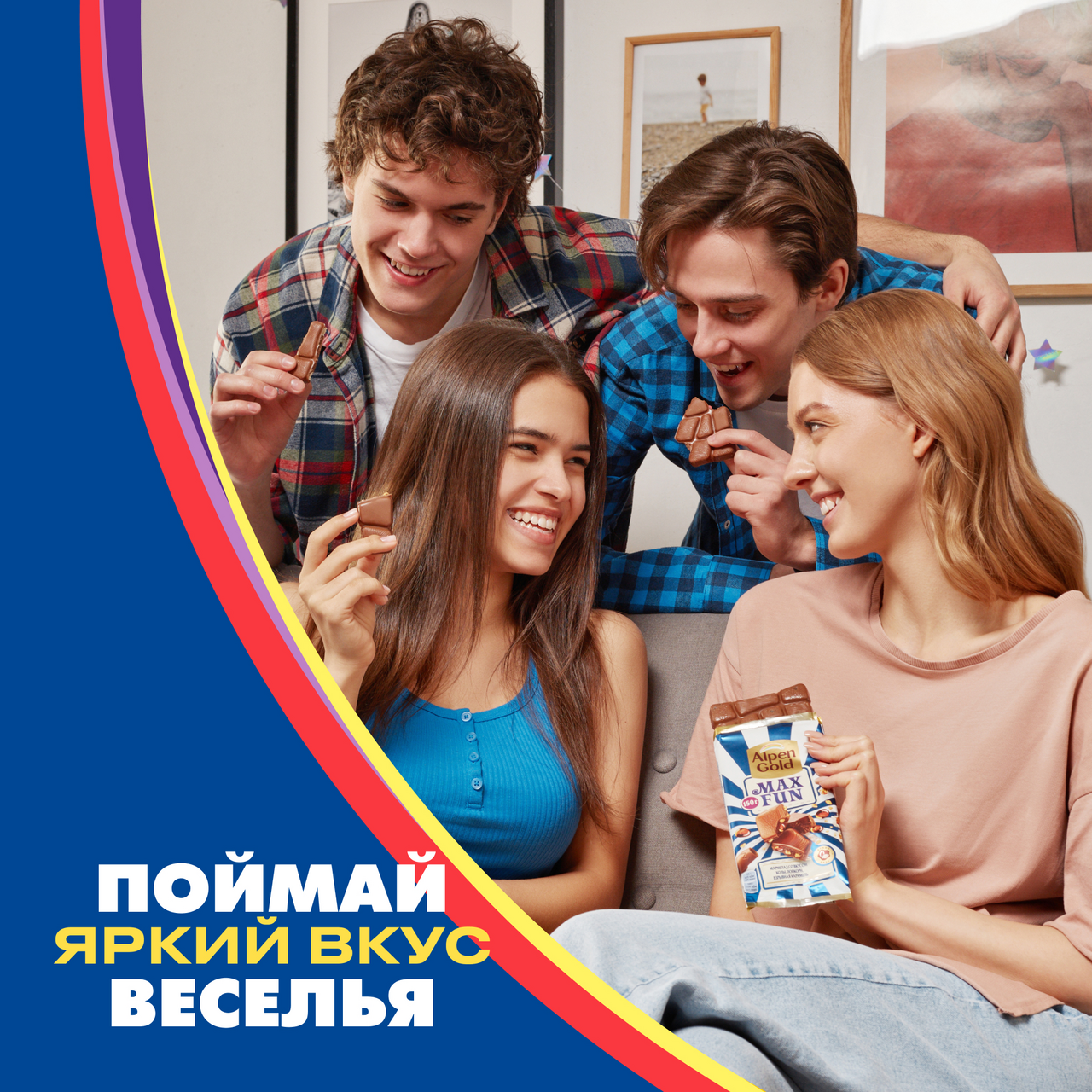 Участвует в конкурсе: Выиграйте кофемашину на сладкое! Совершите покупку товаров-участников на сумму от 1500₽ с 23 октября 2025г. по 14 января 2026г. и получите шанс выиграть кофемашину или другие сладкие призы! Чем больше покупок - тем больше шансов на победу! Подробнее об акции - https://cdn.metro-cc.ru/ru/mndlz_2025.pdf. Alpen Gold уже более 25 лет радует ценителей шоколада необычными вкусовыми сочетаниями. Alpen Gold Max Fun — это сюрприз в каждом кусочке: никогда не знаешь, что попадется именно сейчас. Нежный вкус молочного шоколада дополняет ароматное печенье, разноцветный мармелад и пикантная взрывная карамель. Шоколад с печеньем и мармеладом Alpen Gold Max Fun производится по высоким стандартам качества из какао-продуктов, заряжает ярким настроением и приглашает к вкусным открытиям. Alpen Gold Max Fun — это яркие миксы из молочного шоколада, взрывной карамели, шипучих шариков, мармелада и других вкусных ингредиентов. Попробуй все вкусы Alpen Gold Max Fun: жуй, хрусти и выбери из них свой любимый! Шоколад Alpen Gold Max Fun можно взять с собой на учебу, в гости или на вечеринку: большой плитки хватит на целую компанию друзей. Яркий вкус веселья вместе с Alpen Gold!