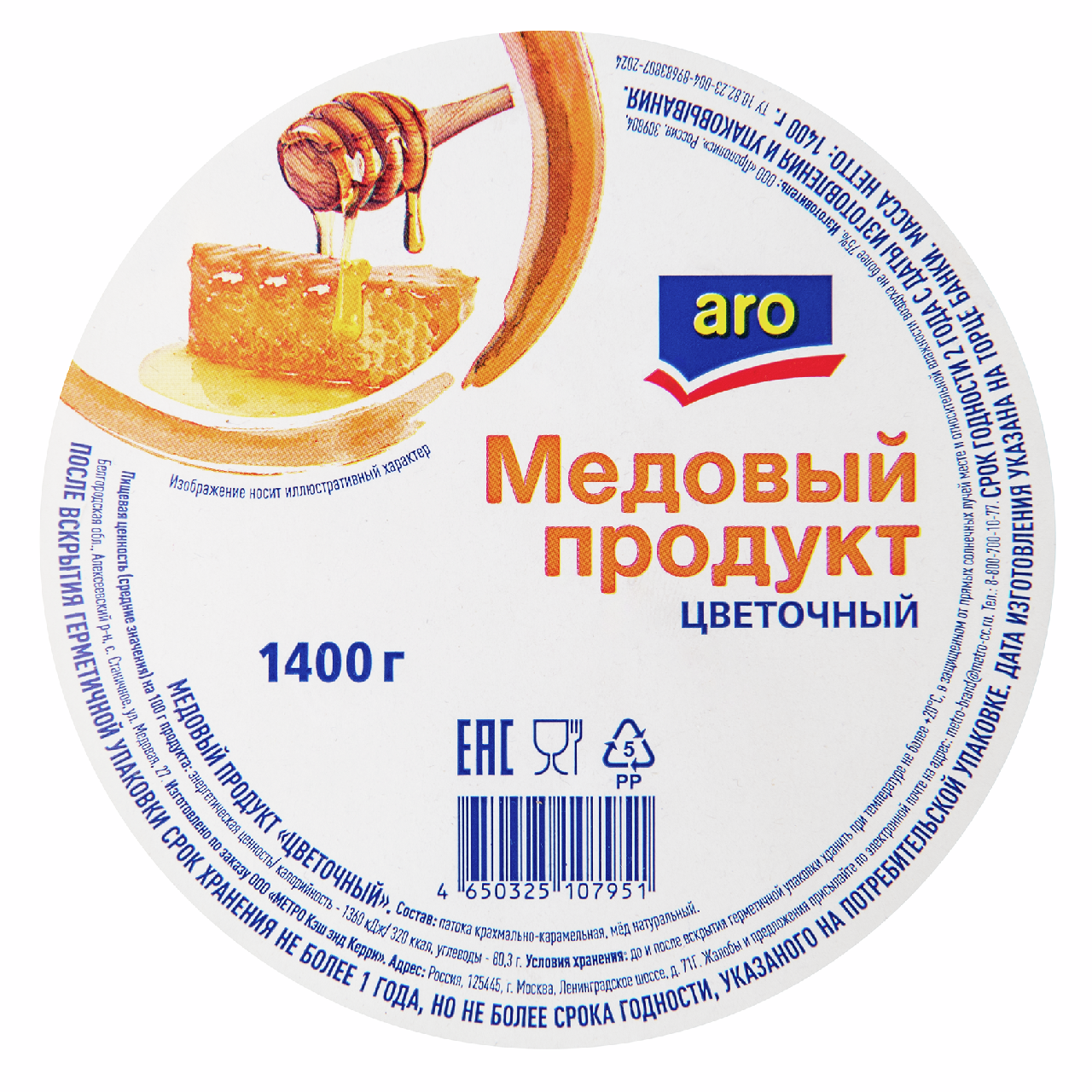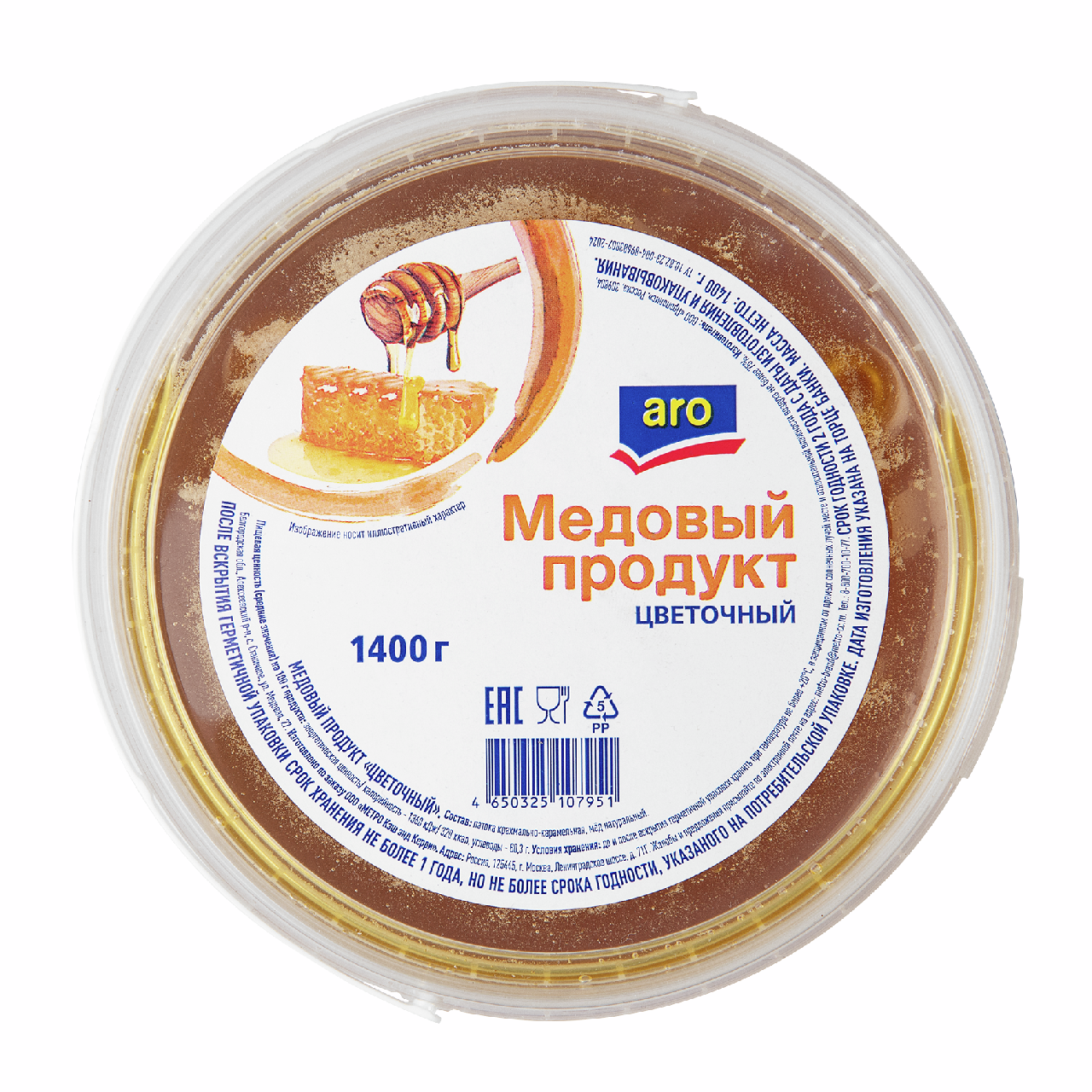 aro Продукт медовый цветочный, 1.4кг - сладкий продукт соединяет пыльцу и нектар с нескольких растений, поэтому приносит максимальную пользу организму. Это источник легкоусвояемых углеводов (фруктозы, глюкозы), белков, аминокислот, биологически активных веществ, а также широкого спектра витаминов и микроэлементов. Цветочный мед тонизирует, ускоряет заживление ран, стимулирует иммунную систему, активно борется с симптомами респираторных заболеваний, очищает от токсинов. Его можно употреблять самостоятельно, использовать для приготовления выпечки, соусов, маринадов и напитков.